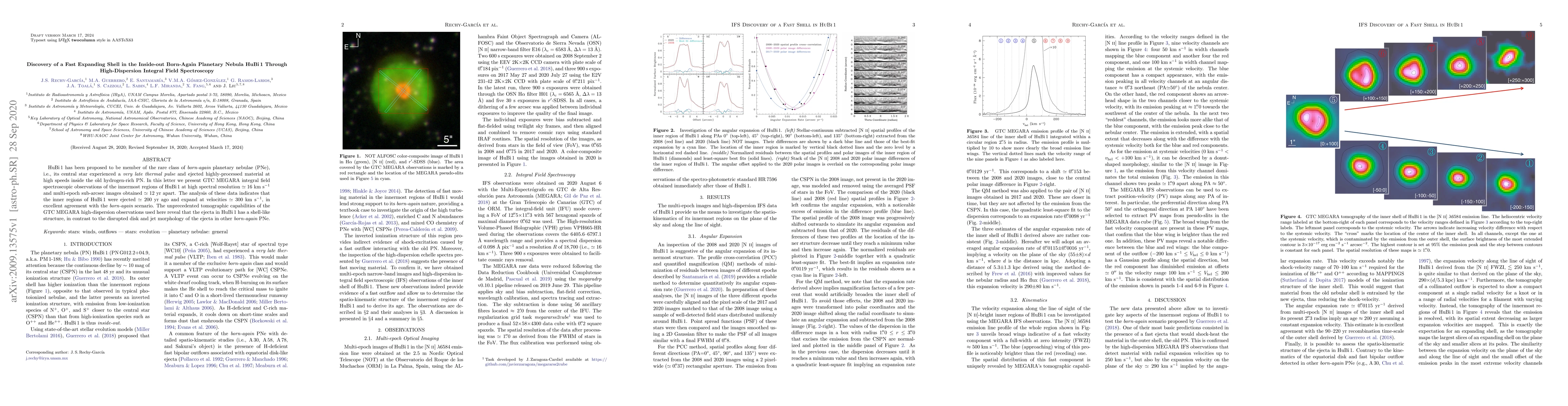 HuBi 1 has been proposed to be member of the rare class of born-again planetary nebulae (PNe), i.e., its central star experienced a very late thermal pulse and ejected highly-processed material at high speeds inside the old hydrogen-rich PN. In this letter we present GTC MEGARA integral field spectroscopic observations of the innermost regions of HuBi 1 at high spectral resolution $\simeq16$ km s$^{-1}$ and multi-epoch sub-arcsec images obtained $\simeq 12$ yr apart. The analysis of these data indicates that the inner regions of HuBi 1 were ejected $\simeq200$ yr ago and expand at velocities $\simeq300$ km s$^{-1}$, in excellent agreement with the born-again scenario. The unprecedented tomographic capabilities of the GTC MEGARA high-dispersion observations used here reveal that the ejecta in HuBi 1 has a shell-like structure, in contrast to the disrupted disk and jet morphology of the ejecta in other born-again PNe.