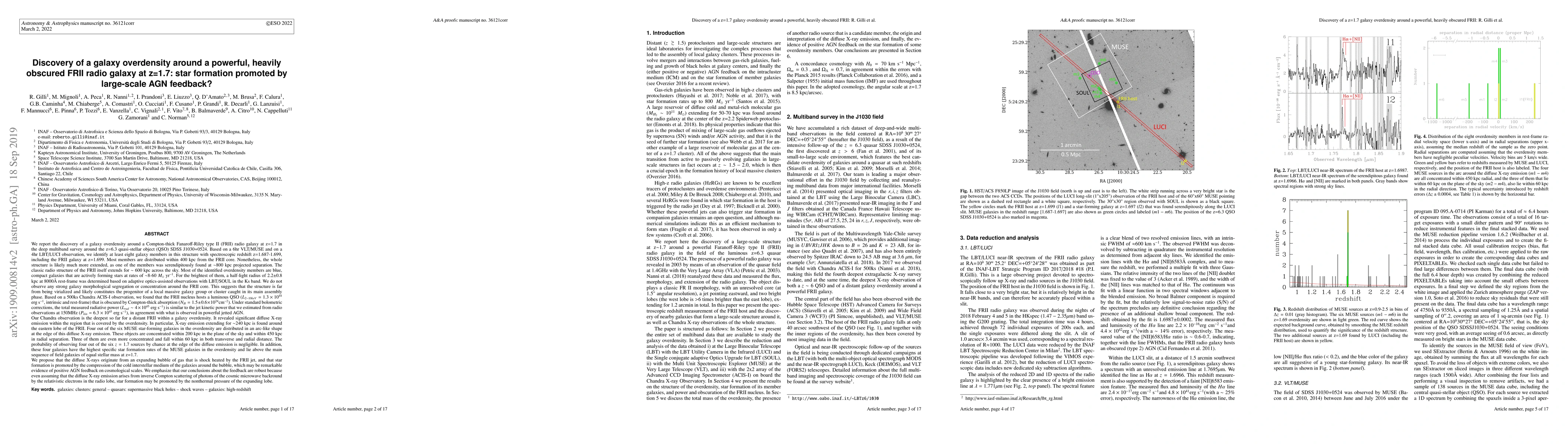 Researchers discovered a galaxy overdensity around a Compton-thick FRII radio galaxy at z=1.7, revealing at least eight actively star-forming blue galaxies. The FRII nucleus hosts a luminous, obscured quasar, and diffuse X-ray emission suggests AGN feedback promoting star formation in the surrounding galaxies.