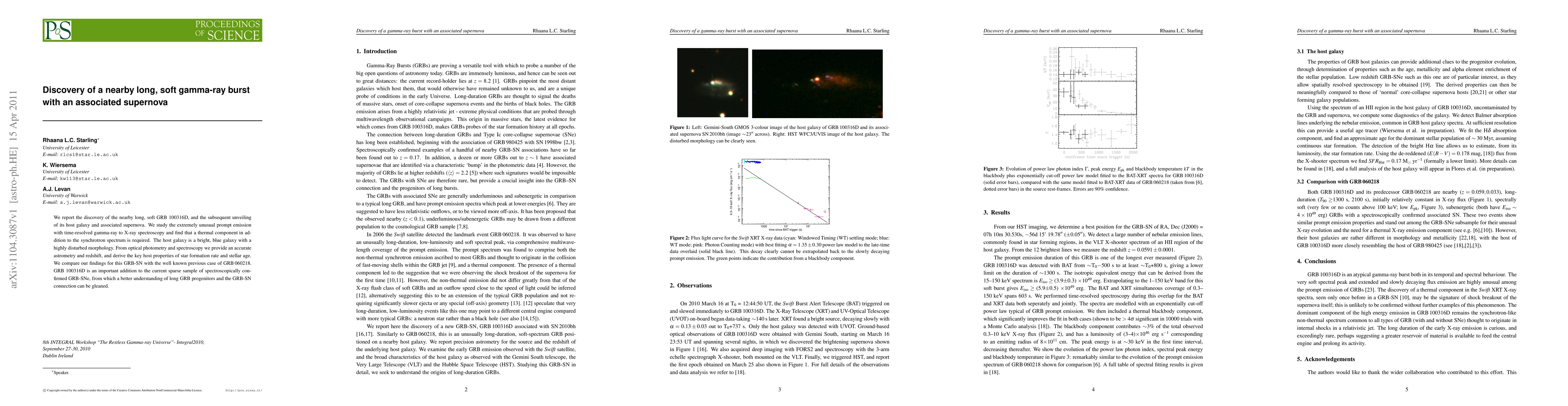 This paper reports the discovery of the long, soft gamma-ray burst GRB 100316D and its associated supernova, revealing a thermal component in the emission. The host galaxy is characterized as a bright, blue galaxy with disturbed morphology, providing insights into the connection between long GRBs and supernovae.