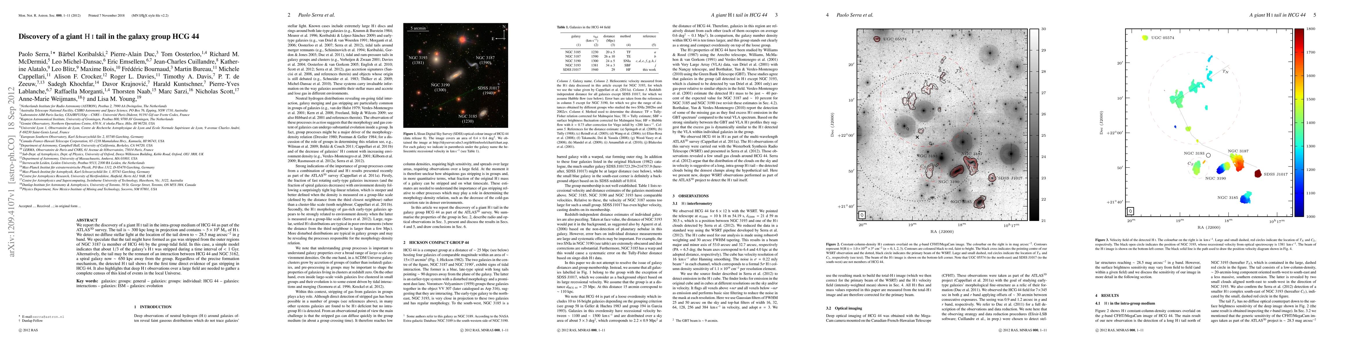 The paper reports the discovery of a giant HI tail in the galaxy group HCG 44, revealing direct evidence of gas stripping likely due to tidal forces or interactions with another galaxy. This finding underscores the need for extensive HI observations to fully understand such events in the local universe.