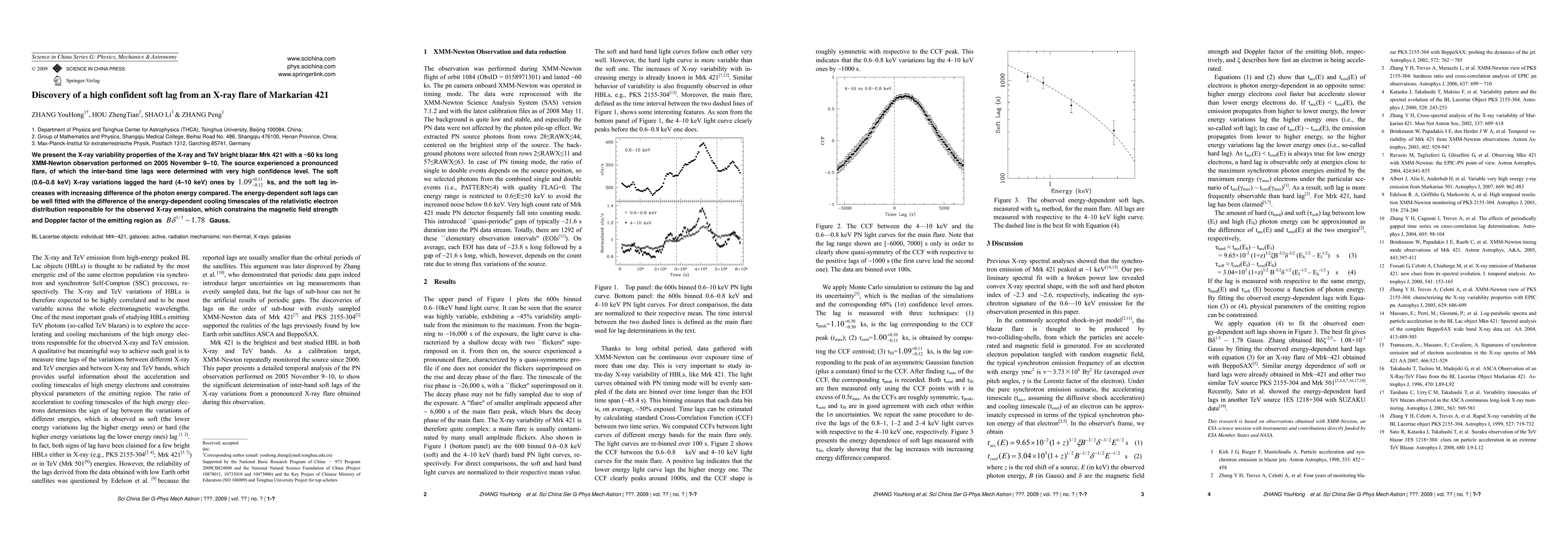 We present the X-ray variability properties of the X-ray and TeV bright blazar Mrk 421 with a ~60 ks long XMM-Newton observation performed on November 9-10, 2005. The source experienced a pronounced flare, of which the inter-band time lags were determined with a very high confidence level. The soft (0.6-0.8 keV) X-ray variations lagged the hard (4-10 keV) ones by 1.09 ks, and the soft lag increases with increasing difference in the photon energy. The energy-dependent soft lags can be well fitted with the difference of the energy-dependent cooling timescales of the relativistic electron distribution responsible for the observed X-ray emission, which constrains the magnetic field strength and Doppler factor of the emitting region to be B\delta^(1/3)~1.78 Gauss.