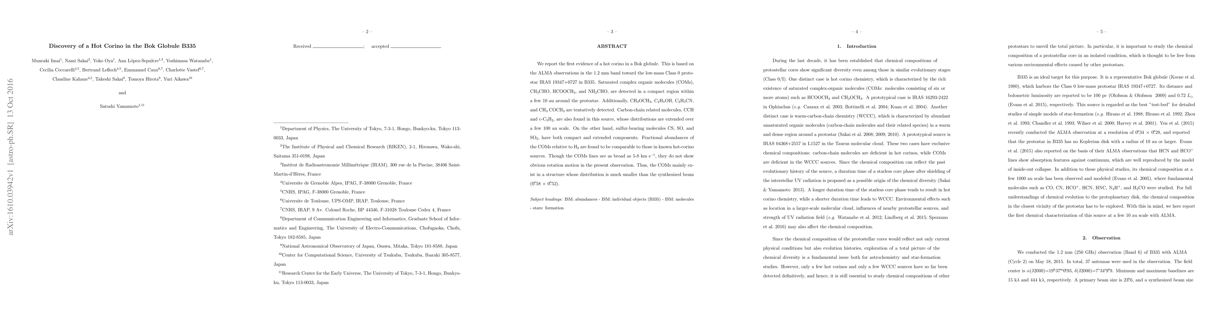 We report the first evidence of a hot corino in a Bok globule. This is based on the ALMA observations in the 1.2 mm band toward the low-mass Class 0 protostar IRAS 19347+0727 in B335. Saturated complex organic molecules (COMs), CH$_3$CHO, HCOOCH$_3$, and NH$_2$CHO, are detected in a compact region within a few 10 au around the protostar. Additionally, CH$_3$OCH$_3$, C$_2$H$_5$OH, C$_2$H$_5$CN, and CH$_3$COCH$_3$ are tentatively detected. Carbon-chain related molecules, CCH and c-C$_3$H$_2$, are also found in this source, whose distributions are extended over a few 100 au scale. On the other hand, sulfur-bearing molecules CS, SO, and SO$_2$, have both compact and extended components. Fractional abundances of the COMs relative to H$_2$ are found to be comparable to those in known hot-corino sources. Though the COMs lines are as broad as 5-8 km s$^{-1}$, they do not show obvious rotation motion in the present observation. Thus, the COMs mainly exist in a structure whose distribution is much smaller than the synthesized beam (0."58 x 0."52).