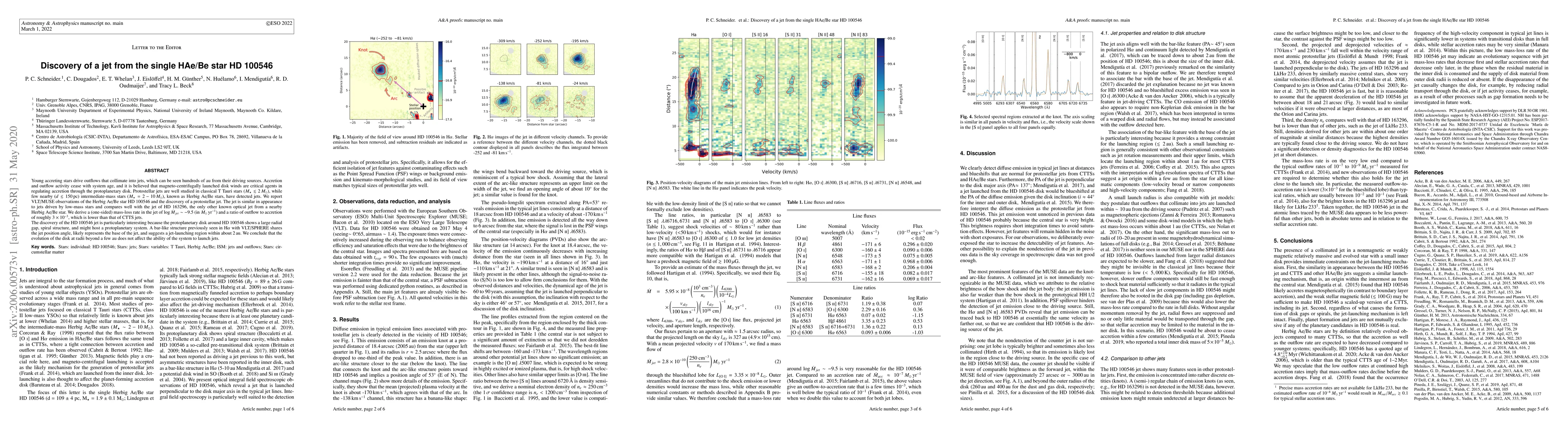 Young accreting stars drive outflows that collimate into jets, which can be seen hundreds of au from their driving sources. Accretion and outflow activity cease with system age, and it is believed that magneto-centrifugally launched disk winds are critical agents in regulating accretion through the protoplanetary disk. Protostellar jets are well studied in classical T~Tauri stars ($M_\star\lesssim2\,M_\odot$), while few nearby ($d\lesssim150\,$pc) intermediate-mass stars ($M_\star=2-10\,M_\odot$), known as Herbig Ae/Be stars, have detected jets. We report VLT/MUSE observations of the Herbig~Ae/Be star HD~100546 and the discovery of a protostellar jet. The jet is similar in appearance to jets driven by low-mass stars and compares well with the jet of HD~163296, the only other known optical jet from a nearby Herbig~Ae/Be star. We derive a (one-sided) mass-loss rate in the jet of $\log \dot{M}_{jet} \sim -9.5$ (in $M_\odot$\,yr$^{-1}$) and a ratio of outflow to accretion of roughly $3\times10^{-3}$, which is lower than that of CTTS jets. The discovery of the HD~100546 jet is particularly interesting because the protoplanetary disk around HD~100546 shows a large radial gap, spiral structure, and might host a protoplanetary system. A bar-like structure previously seen in H$\alpha$ with VLT/SPHERE shares the jet position angle, likely represents the base of the jet, and suggests a jet-launching region within about 2\,au. We conclude that the evolution of the disk at radii beyond a few au does not affect the ability of the system to launch jets.