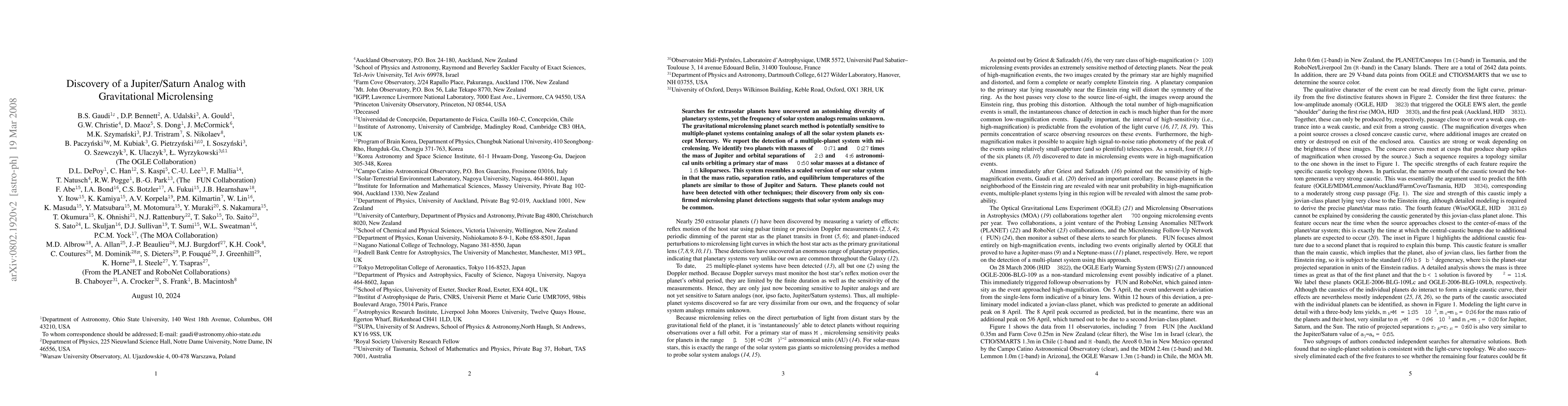 This paper reports the discovery of a multiple-planet system resembling a scaled version of our solar system, detected via gravitational microlensing. The system includes two planets with masses similar to Jupiter and Saturn, suggesting that solar system analogs may be more common than previously thought.