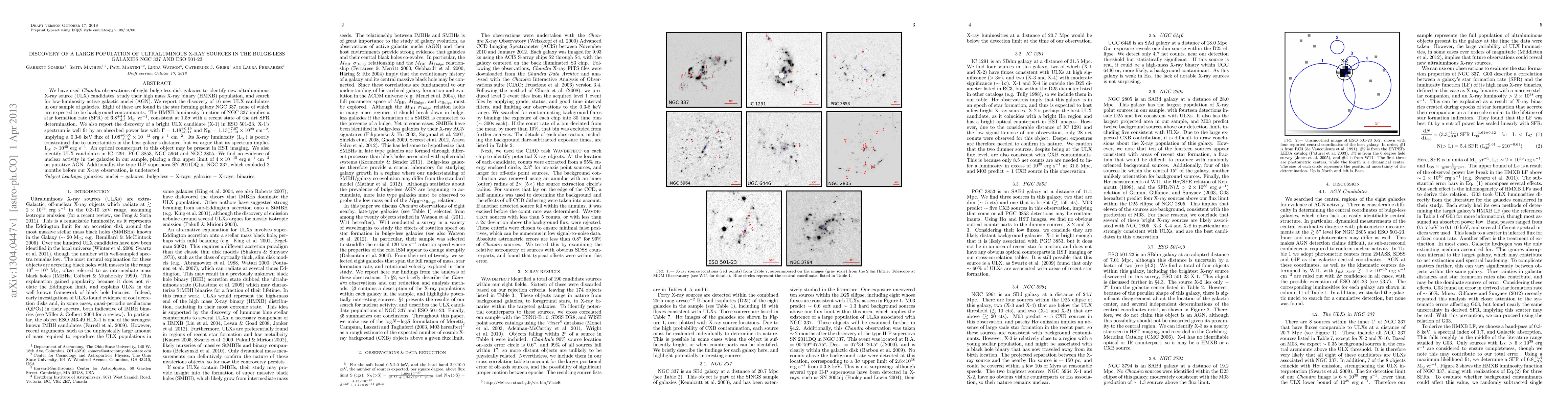 We have used Chandra observations of eight bulge-less disk galaxies to identify new ultraluminous X-ray source (ULX) candidates, study their high mass X-ray binary (HMXB) population, and search for low-luminosity active galactic nuclei (AGN). We report the discovery of 16 new ULX candidates in our sample of galaxies. Eight of these are found in the star forming galaxy NGC 337, none of which are expected to be background contaminants. The HMXB luminosity function of NGC 337 implies a star formation rate (SFR) of 6.8$^{+4.4}_{-3.5}$ \msun\ yr$^{-1}$, consistent at 1.5$\sigma$ with a recent state of the art SFR determination. We also report the discovery of a bright ULX candidate (X-1) in ESO 501-23. X-1's spectrum is well fit by an absorbed power law with $\Gamma = 1.18^{+0.19}_{-0.11}$ and N$\rm{_H}$ = 1.13$^{+7.07}_{-1.13} \times 10^{20}$ cm$^{-2}$, implying a 0.3-8 keV flux of $1.08^{+0.05}_{-0.07} \times 10^{-12}$ \esc. Its X-ray luminosity (L$_X$) is poorly constrained due to uncertainties in the host galaxy's distance, but we argue that its spectrum implies L$_X > 10^{40}$ \es. An optical counterpart to this object may be present in HST imaging. We also identify ULX candidates in IC 1291, PGC 3853, NGC 5964 and NGC 2805. We find no evidence of nuclear activity in the galaxies in our sample, placing a flux upper limit of $4 \times 10^{-15}$ \esc\ on putative AGN. Additionally, the type II-P supernova SN 2011DQ in NGC 337, which exploded 2 months before our X-ray observation, is undetected.