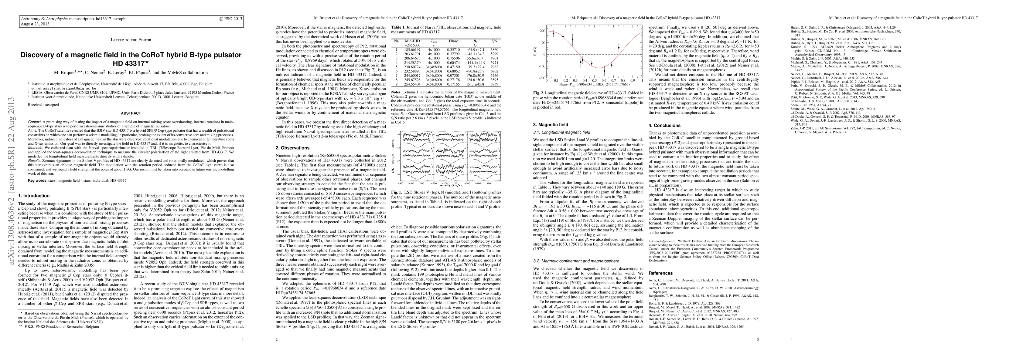 The CoRoT satellite identified HD 43317 as a hybrid SPB/beta Cep-type pulsator, revealing an oblique magnetic field with a strength of about 1 kG at the poles, detected through spectropolarimetry and confirmed by Zeeman signatures in the star's light. This magnetic field discovery will inform future seismic models of the star's internal mixing processes.