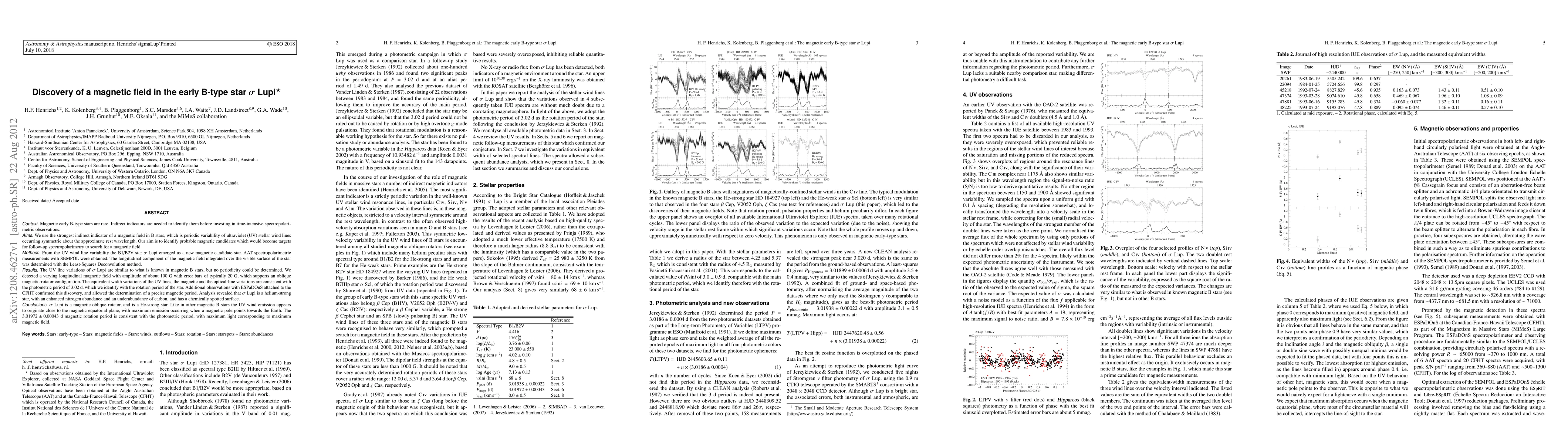 Magnetic early B-type stars are rare. To identify them, we use the strongest indirect indicator of a magnetic field in B stars, which is periodic variability of UV stellar wind lines occurring symmetric about the approximate rest wavelength. Probable magnetic candidates are targets for follow-up spectropolarimetry to search for a magnetic field. From the UV wind line variability the B1/B2V star sigma Lupi emerged as a new magnetic candidate star. AAT spectropolarimetric measurements with SEMPOL were obtained. The longitudinal component of the magnetic field integrated over the visible surface of the star was determined with the Least-Squares Deconvolution method. The UV line variations of sigma Lupi are similar to what is known in magnetic B stars, but no periodicity could be determined. We detected a varying longitudinal magnetic field with amplitude of about 100 G with error bars of typically 20 G, which supports an oblique magnetic-rotator configuration. The EW variations of the UV lines, the magnetic and the optical-line variations are consistent with the photometric period of 3.02 d, which we identify with the rotation period of the star. Additional observations with ESPaDOnS attached to the CFHT confirmed this discovery, and allowed the determination of a precise magnetic period. Analysis revealed that sigma Lupi is a He-strong star, with an enhanced N abundance and an underabundance of C, and has a chemically spotted surface. Like in other magnetic B stars the UV wind emission appears to originate close to the magnetic equatorial plane, with maximum emission when a magnetic pole points towards the Earth. The 3.01972(43) d magnetic rotation period is consistent with the photometric period, with maximum light corresponding to maximum magnetic field.