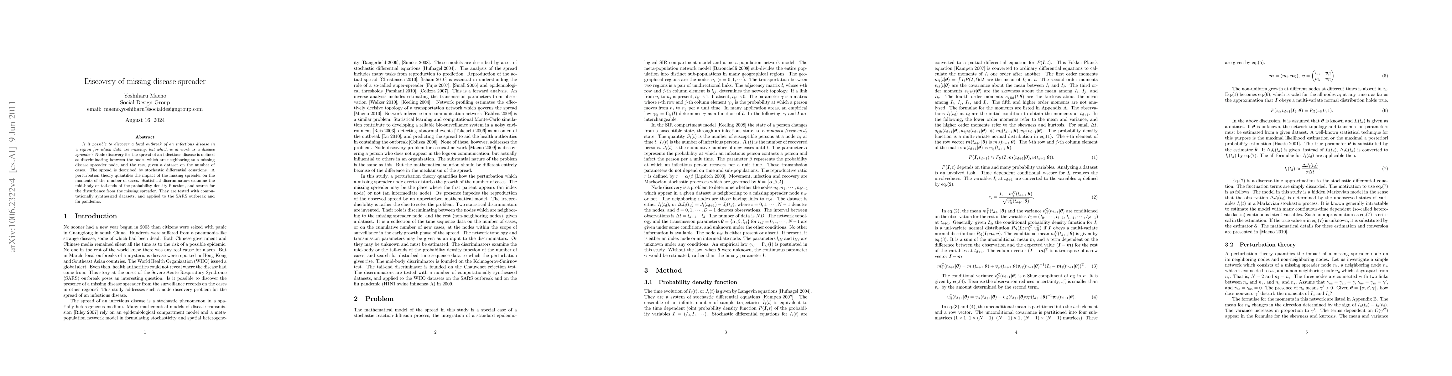 This study presents a method to discover an outbreak of an infectious disease in a region for which data are missing, but which is at work as a disease spreader. Node discovery for the spread of an infectious disease is defined as discriminating between the nodes which are neighboring to a missing disease spreader node, and the rest, given a dataset on the number of cases. The spread is described by stochastic differential equations. A perturbation theory quantifies the impact of the missing spreader on the moments of the number of cases. Statistical discriminators examine the mid-body or tail-ends of the probability density function, and search for the disturbance from the missing spreader. They are tested with computationally synthesized datasets, and applied to the SARS outbreak and flu pandemic.