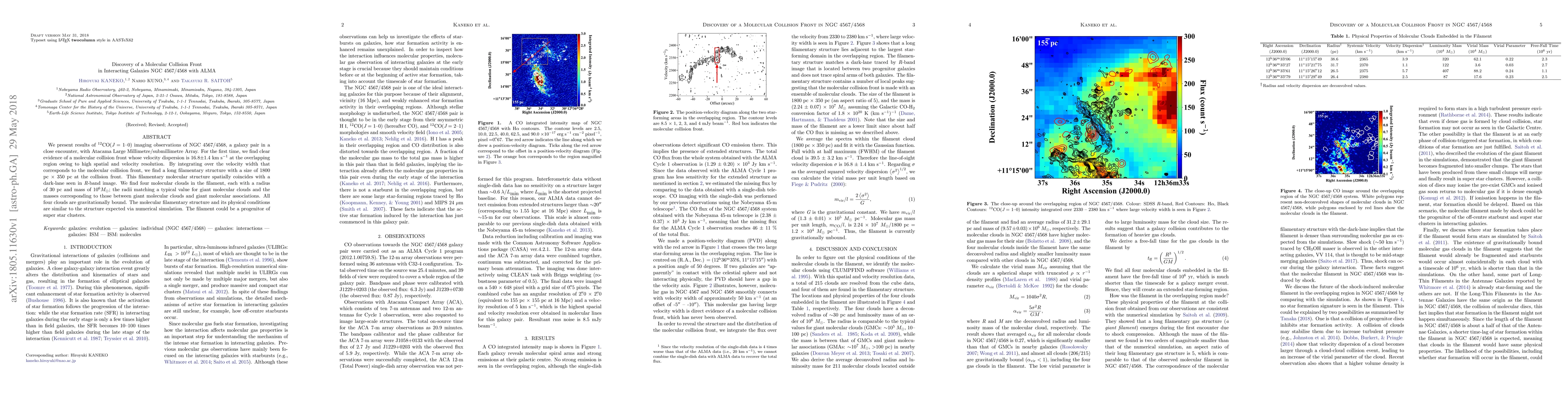 This study reveals the first evidence of a molecular collision front in the interacting galaxies NGC 4567/4568 using ALMA observations, characterized by a velocity dispersion of 16.8±1.4 km s$^{-1}$. The filamentary structure, 1800 pc × 350 pc, contains four gravitationally bound molecular clouds, potentially precursors to super star clusters.
