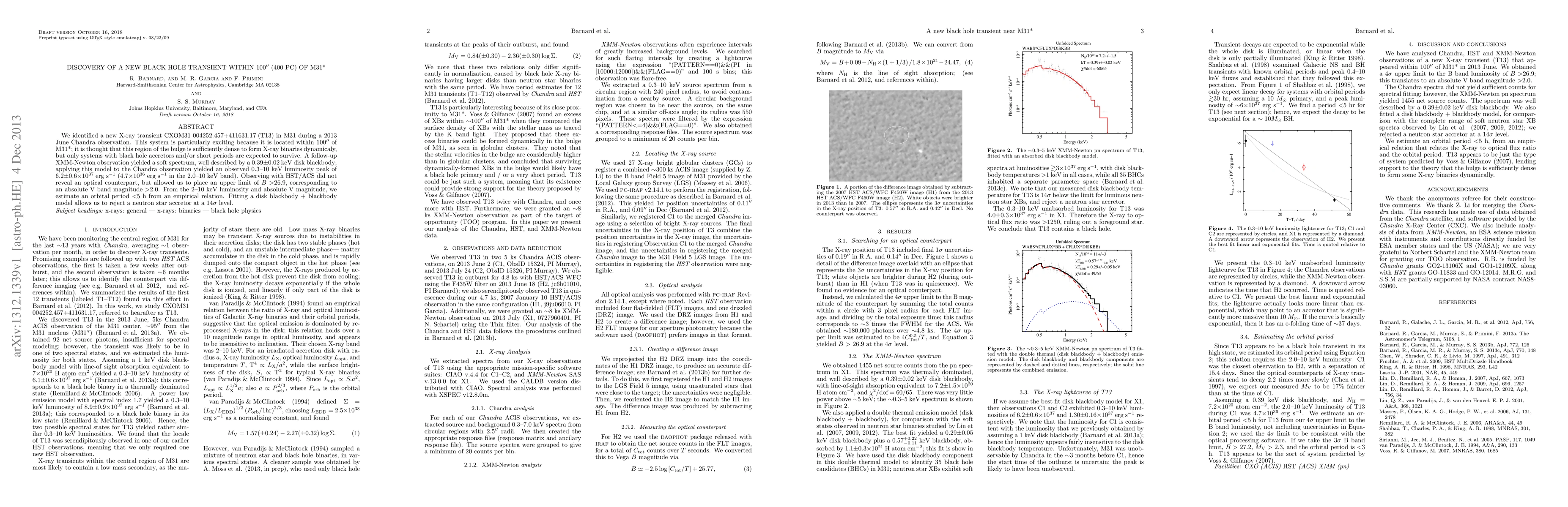 We identified a new X-ray transient CXOM31 004252.457+411631.17 (T13) in M31 during a 2013 June Chandra observation. This system is particularly exciting because it is located within 100" of M31*; it is thought that this region of the bulge is sufficiently dense to form X-ray binaries dynamicaly, but only systems with black hole accretors and/or short periods are expected to survive. A follow-up XMM-Newton observation yielded a soft spectrum, well described by a 0.39+/-0.02 keV disk blackbody; applying this model to the Chandra observation yielded an observed 0.3--10 keV luminosity peak of 6.2+/-0.6 E+37 erg/s (4.7 E+36 erg/s in the 2.0--10 keV band). Observing with HST/ACS did not reveal an optical counterpart, but allowed us to place an upper limit of B >26.9, corresponding to an absolute V band magnitude >2.0. From the 2--10 keV luminosity and absolute V magnitude, we estimate an orbital period $<$5 h from an empirical relation. Fitting a disk blackbody + blackbody model allows us to reject a neutron star accretor at a 14 sigma level.