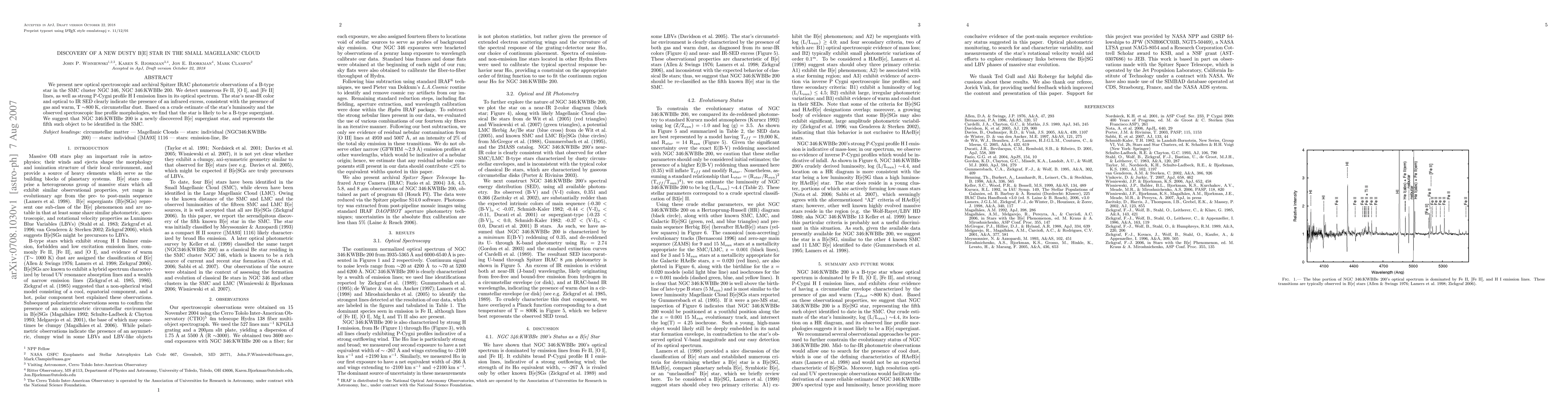 We present new optical spectroscopic and archival Spitzer IRAC photometric observations of a B-type star in the SMC cluster NGC 346, NGC 346:KWBBe 200. We detect numerous Fe II, [O I], and [Fe II] lines, as well as strong P-Cygni profile H I emission lines in its optical spectrum. The star's near-IR color and optical to IR SED clearly indicate the presence of an infrared excess, consistent with the presence of gas and warm, T ~800 K, circumstellar dust. Based on a crude estimate of the star's luminosity and the observed spectroscopic line profile morphologies, we find that the star is likely to be a B-type supergiant. We suggest that NGC 346:KWBBe 200 is a newly discovered B[e] supergiant star, and represents the fifth such object to be identified in the SMC.