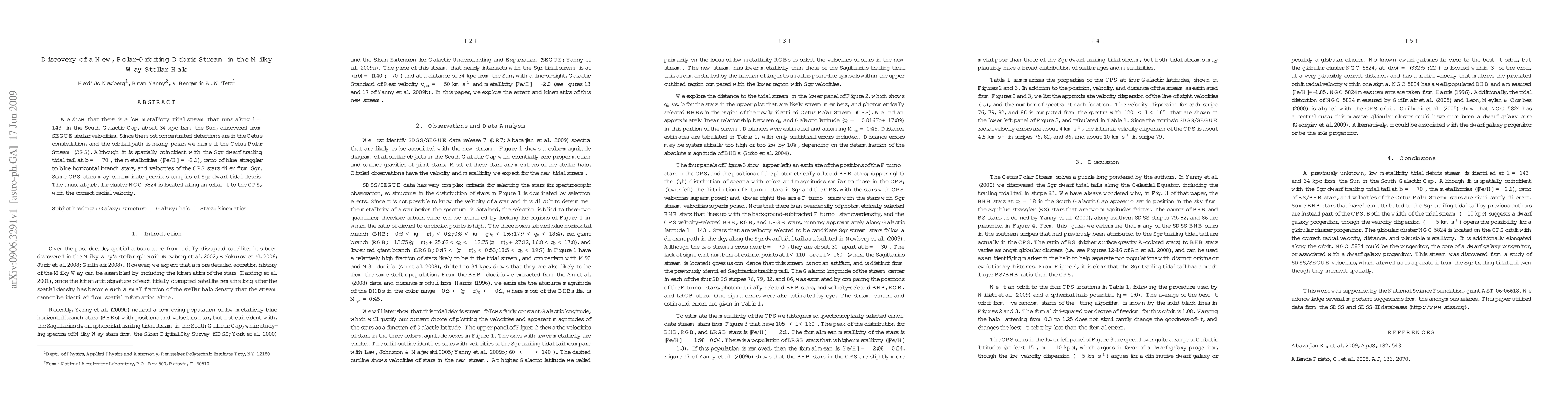 This paper discovers a new low metallicity tidal stream, named the Cetus Polar Stream (CPS), in the Milky Way's stellar halo, identified through SEGUE stellar velocities. The CPS differs from the Sgr dwarf tidal tail in metallicity, star ratios, and velocities, suggesting it may contaminate previous Sgr samples.