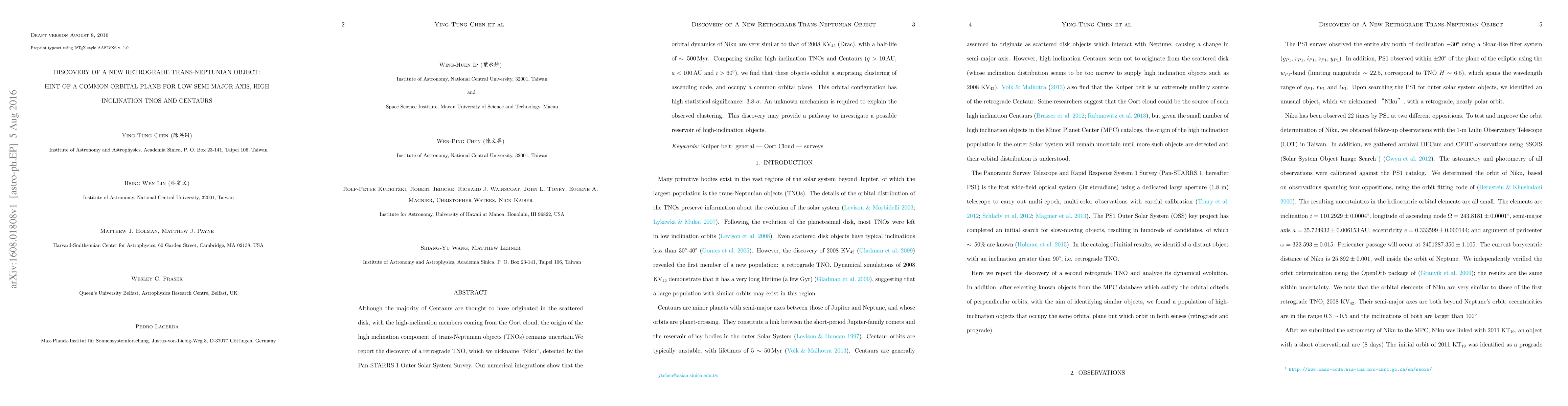 The paper reports the discovery of a new retrograde trans-Neptunian object named "Niku," suggesting a common orbital plane among high inclination TNOs and Centaurs. The findings indicate a statistically significant clustering of these objects, hinting at an unknown mechanism shaping their orbital dynamics.