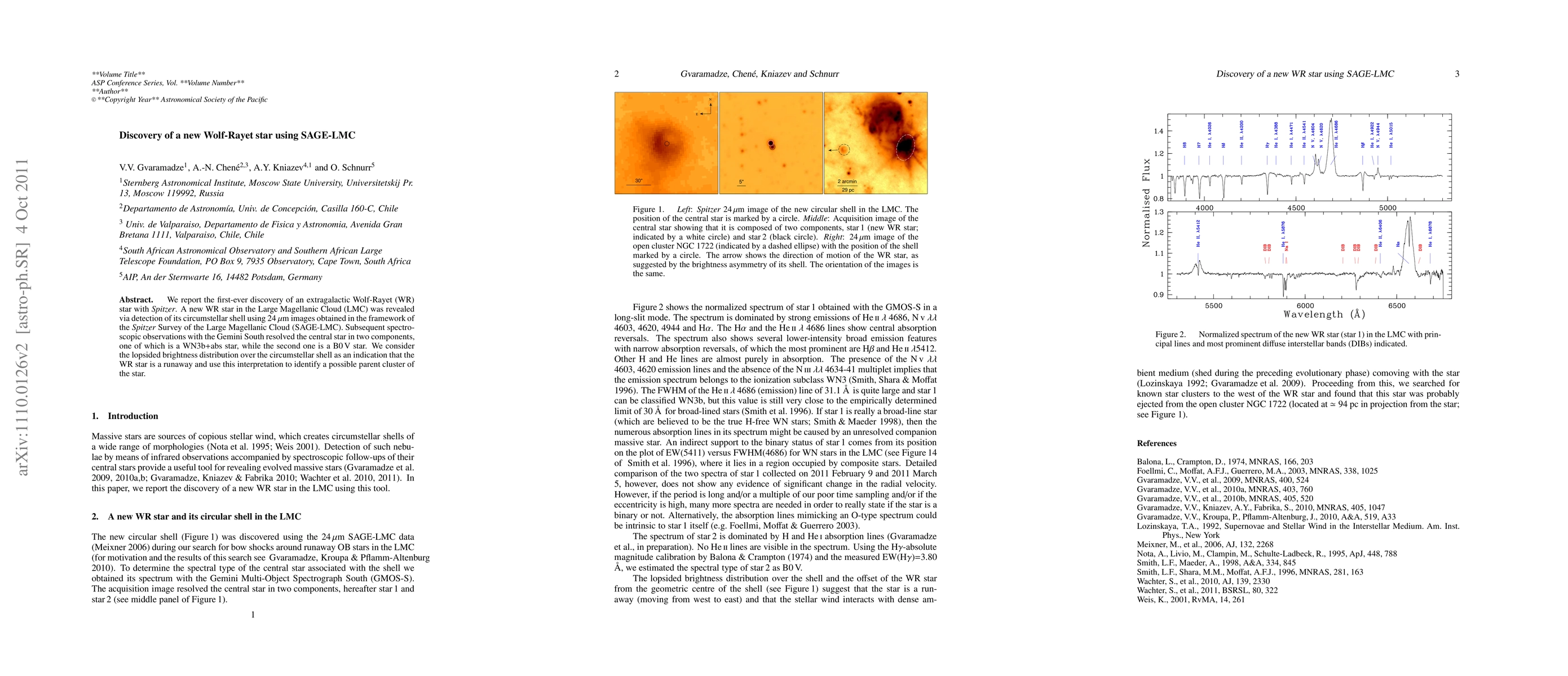 Summary: Researchers discovered the first extragalactic Wolf-Rayet star in the Large Magellanic Cloud using Spitzer's 24 μm images from the SAGE-LMC survey. Spectroscopic observations revealed the star consists of a WN3b+abs component and a B0V star, suggesting the WR star is a runaway with an asymmetric circumstellar shell.