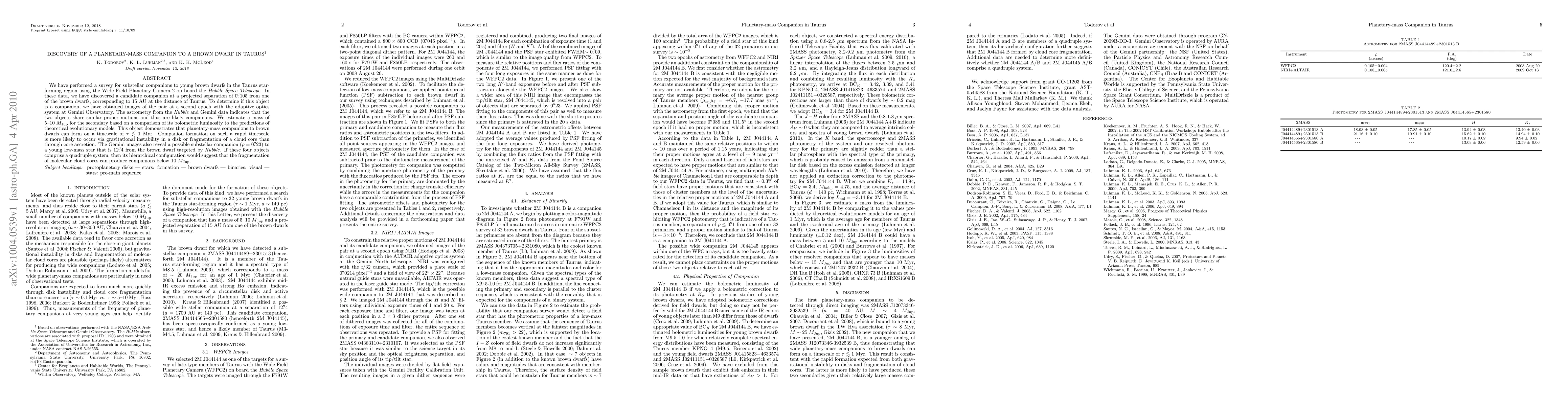 This research discovered a planetary-mass companion to a brown dwarf in Taurus using Hubble and Gemini Observatory data, indicating shared proper motions and a mass of 5-10 Mjup. This suggests rapid companion formation via gravitational instability or cloud fragmentation.