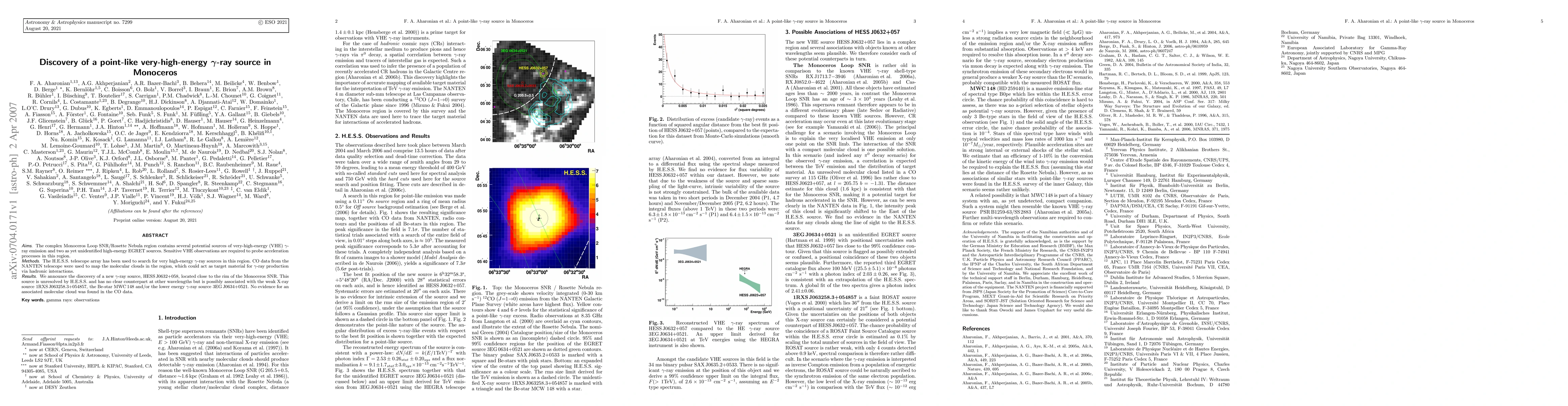 The H.E.S.S. telescope array discovered an unresolved, very-high-energy gamma-ray source, H.E.S.S. J0632+058, near the Monoceros SNR, with no clear counterpart at other wavelengths but potential associations with X-ray and lower energy gamma-ray sources. No molecular cloud was found in CO data near the source.