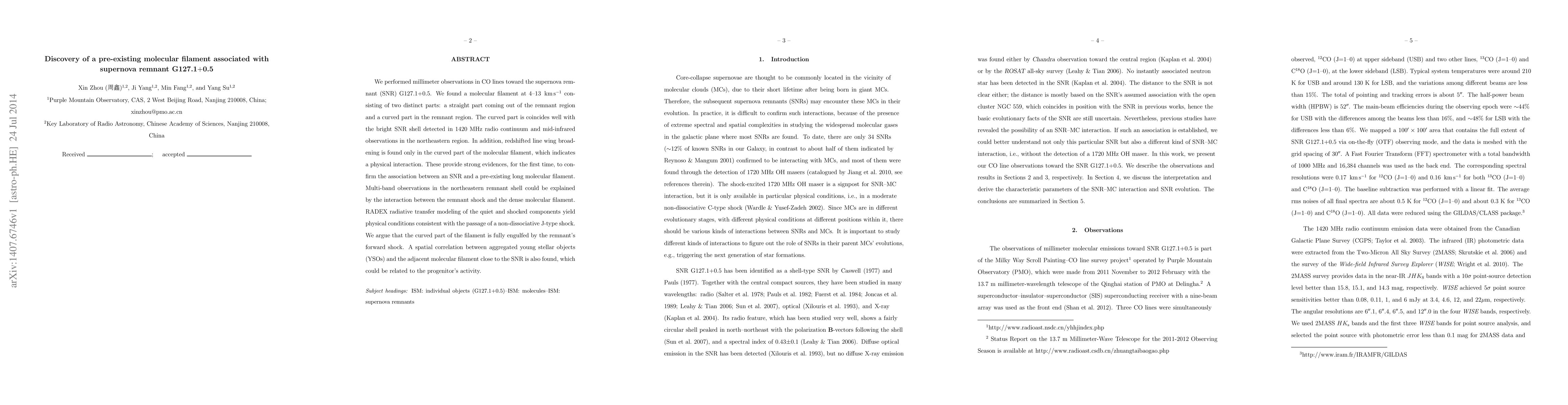 We performed millimeter observations in CO lines toward the supernova remnant (SNR) G127.1+0.5. We found a molecular filament at 4--13 km s$^{-1}$ consisting of two distinct parts: a straight part coming out of the remnant region and a curved part in the remnant region. The curved part is coincides well with the bright SNR shell detected in 1420 MHz radio continuum and mid-infrared observations in the northeastern region. In addition, redshifted line wing broadening is found only in the curved part of the molecular filament, which indicates a physical interaction. These provide strong evidences, for the first time, to confirm the association between an SNR and a pre-existing long molecular filament. Multi-band observations in the northeastern remnant shell could be explained by the interaction between the remnant shock and the dense molecular filament. RADEX radiative transfer modeling of the quiet and shocked components yield physical conditions consistent with the passage of a non-dissociative J-type shock. We argue that the curved part of the filament is fully engulfed by the remnant's forward shock. A spatial correlation between aggregated young stellar objects (YSOs) and the adjacent molecular filament close to the SNR is also found, which could be related to the progenitor's activity.