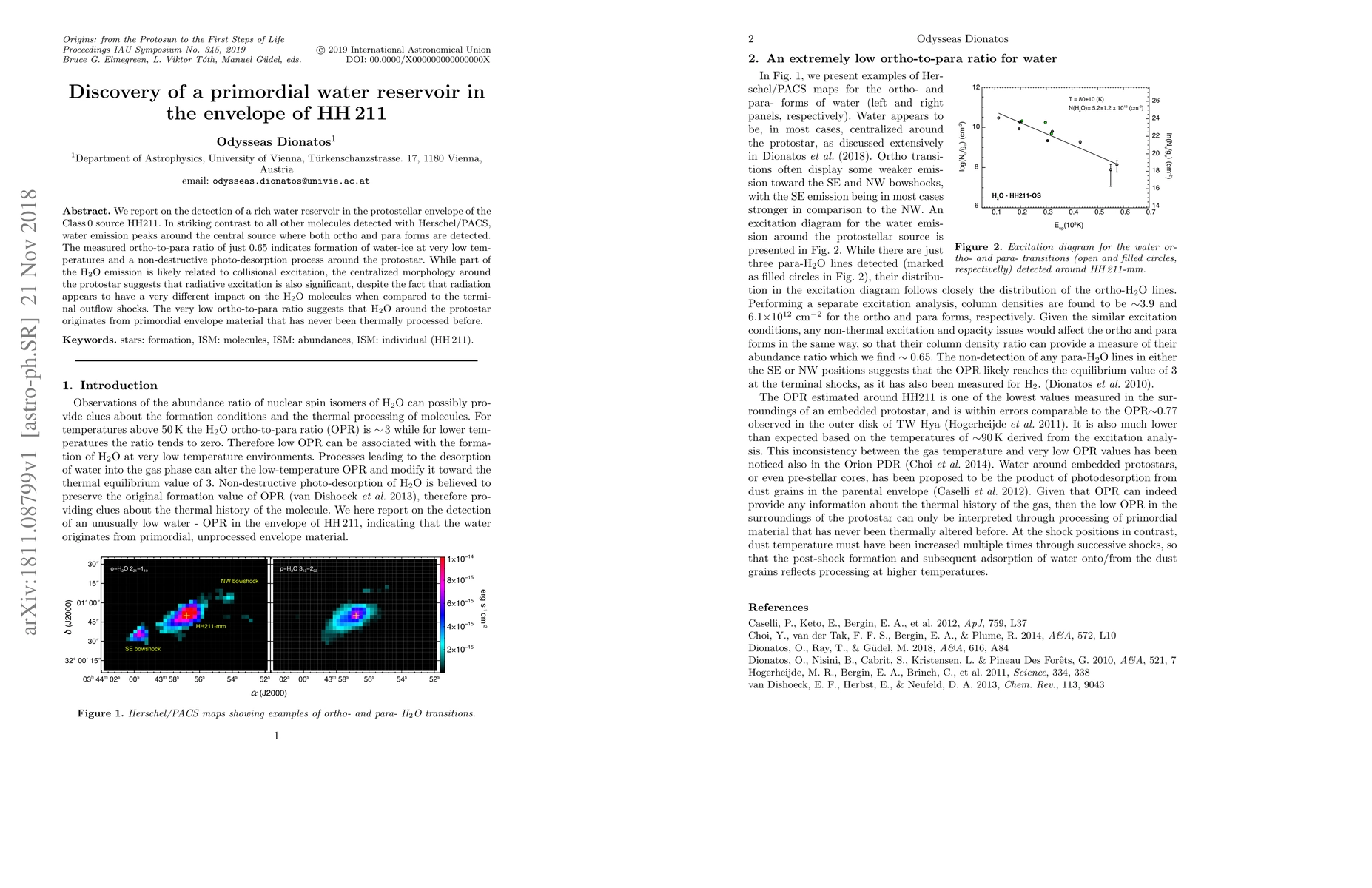 We report on the detection of a rich water reservoir in the protostellar envelope of the Class 0 source HH211. In striking contrast to all other molecules detected with Herschel/PACS, water emission peaks around the central source where both ortho and para forms are detected. The measured ortho-to-para ratio of just 0.65 indicates formation of water-ice at very low temperatures and a non-destructive photo-desorption process around the protostar. While part of the water emission is likely related to collisional excitation, the centralized morphology around the protostar suggests that radiative excitation is also significant, despite the fact that radiation appears to have a very different impact on the water molecules when compared to the terminal outflow shocks. The very low ortho-to-para ratio suggests that water around the protostar originates from primordial envelope material that has never been thermally processed before.