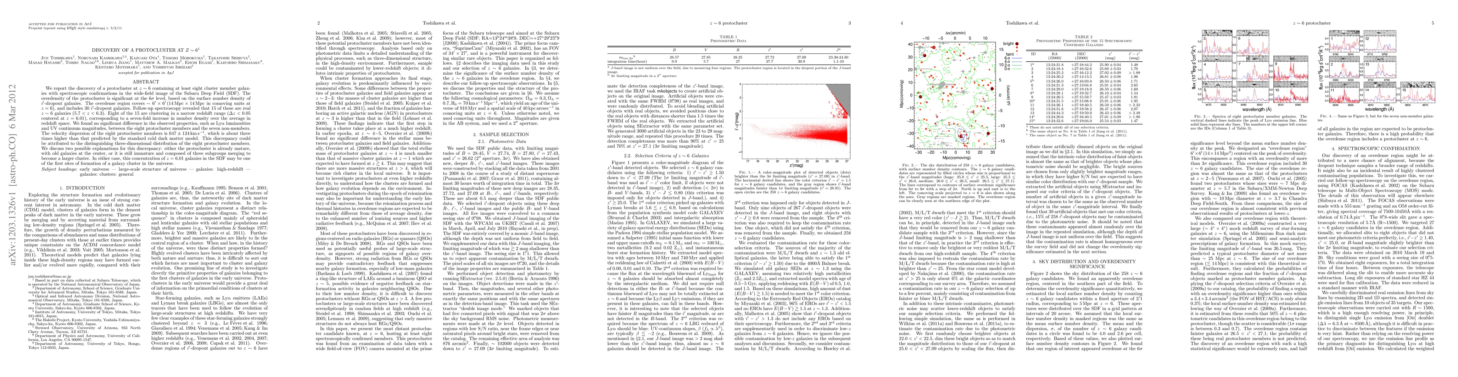 Researchers discovered a protocluster at z~6 in the Subaru Deep Field, containing eight spectroscopically confirmed member galaxies, showing a significant overdensity. The protocluster's velocity dispersion is three times higher than predicted, suggesting either an advanced stage of galaxy formation or merging subgroups, marking it as a potential early site of galaxy cluster formation.