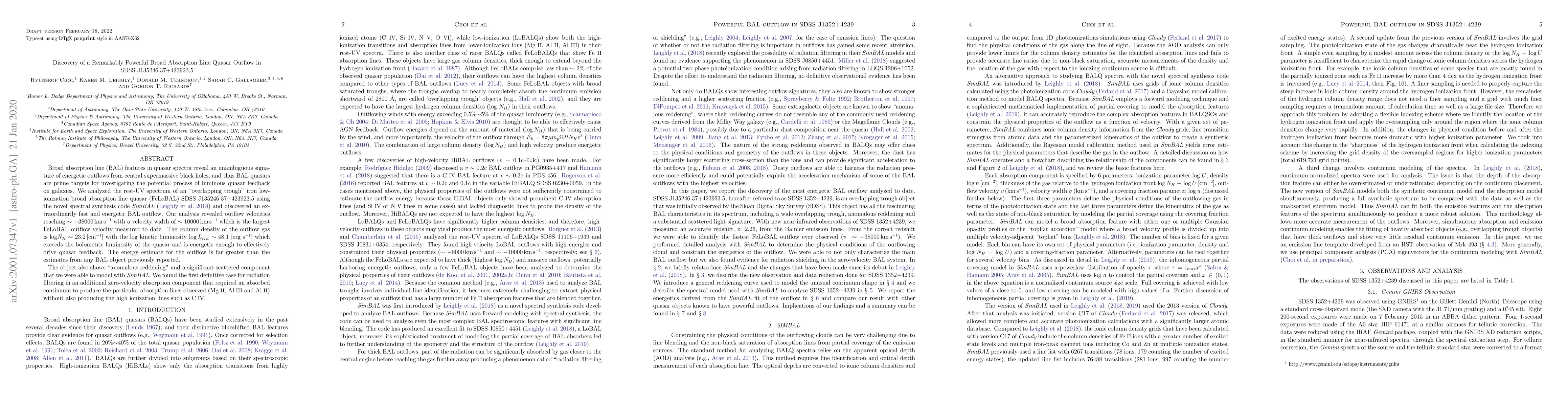 Broad absorption line (BAL) features in quasar spectra reveal an unambiguous signature of energetic outflows from central supermassive black holes, and thus BAL quasars are prime targets for investigating the potential process of luminous quasar feedback on galaxies. We analyzed the rest-UV spectrum of an "overlapping trough" iron low-ionization broad absorption line quasar (FeLoBAL) SDSS J135246.37+423923.5 using the novel spectral synthesis code SimBAL (Leighly et al. 2018) and discovered an extraordinarily fast and energetic BAL outflow. Our analysis revealed outflow velocities reaching $\sim -38000\rm \, km\, s^{-1}$ with a velocity width of $\sim 10000\rm \, km\, s^{-1}$ which is the largest FeLoBAL outflow velocity measured to date. The column density of the outflow gas is log$N_H\sim23.2\,[\rm cm^{-1}]$ with the log kinetic luminosity $\log L_{KE}\sim48.1$ [erg $\rm s^{-1}$] which exceeds the bolometric luminosity of the quasar and is energetic enough to effectively drive quasar feedback. The energy estimate for the outflow is far greater than the estimates from any BAL object previously reported. The object also shows "anomalous reddening" and a significant scattered component that we were able to model with SimBAL. We found the first definitive case for radiation filtering in an additional zero-velocity absorption component that required an absorbed continuum to produce the particular absorption lines observed (MgII, AlIII and AlII) without also producing the high ionization lines such as CIV.
