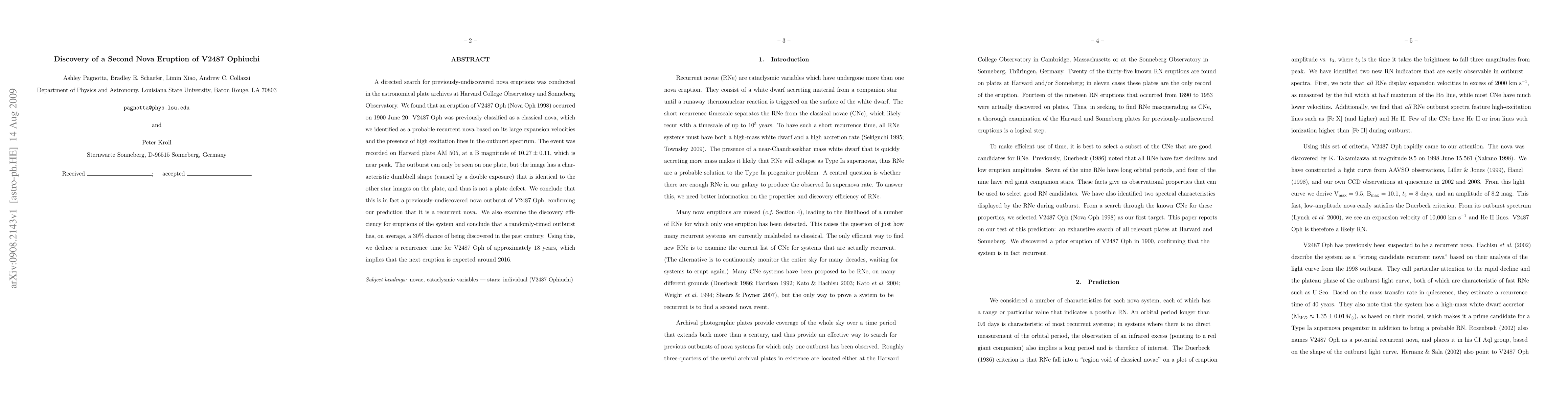 The research paper reports the discovery of a second nova eruption of V2487 Ophiuchi (Nova Oph 1998) in historical archives, classifying it as a recurrent nova with an approximate recurrence period of 18 years, predicting another eruption around 2016.