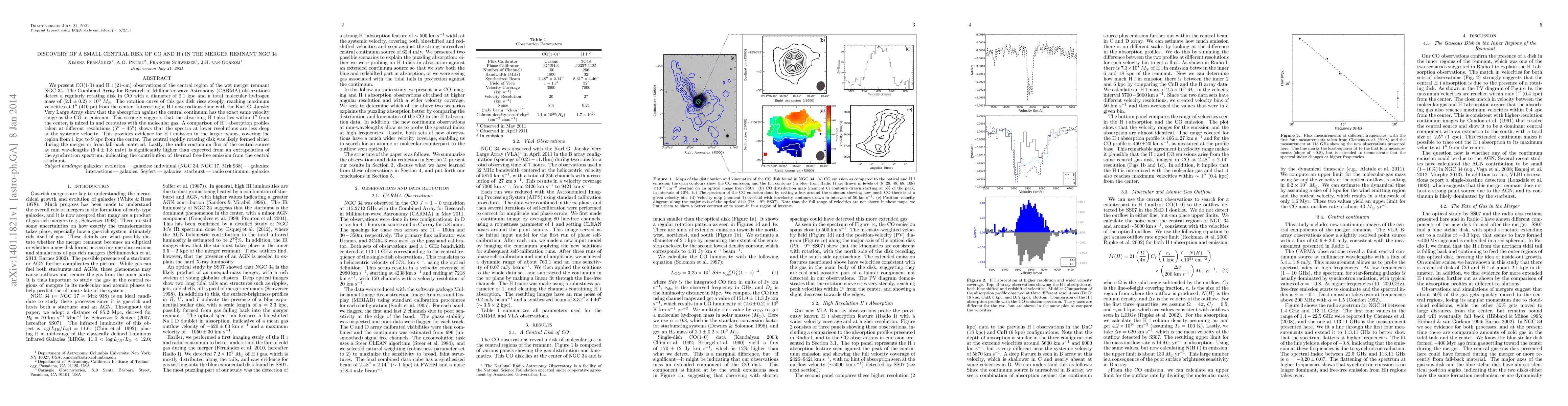We present CO(1-0) and HI(21-cm) observations of the central region of the wet merger remnant NGC 34. The Combined Array for Research in Millimeter-wave Astronomy (CARMA) observations detect a regularly rotating disk in CO with a diameter of 2.1 kpc and a total molecular hydrogen mass of ($2.1 \pm 0.2) \times10^9~M_\odot$. The rotation curve of this gas disk rises steeply, reaching maximum velocities at 1" (410 pc) from the center. Interestingly, HI observations done with the Karl G. Jansky Very Large Array show that the absorption against the central continuum has the exact same velocity range as the CO in emission. This strongly suggests that the absorbing HI also lies within 1" from the center, is mixed in and corotates with the molecular gas. A comparison of HI absorption profiles taken at different resolutions (5"-45") shows that the spectra at lower resolutions are less deep at the systemic velocity. This provides evidence for HI emission in the larger beams, covering the region from 1 kpc to 9 kpc from the center. The central rapidly rotating disk was likely formed either during the merger or from fall-back material. Lastly, the radio continuum flux of the central source at mm wavelengths ($5.4\pm1.8$ mJy) is significantly higher than expected from an extrapolation of the synchrotron spectrum, indicating the contribution of thermal free-free emission from the central starburst.