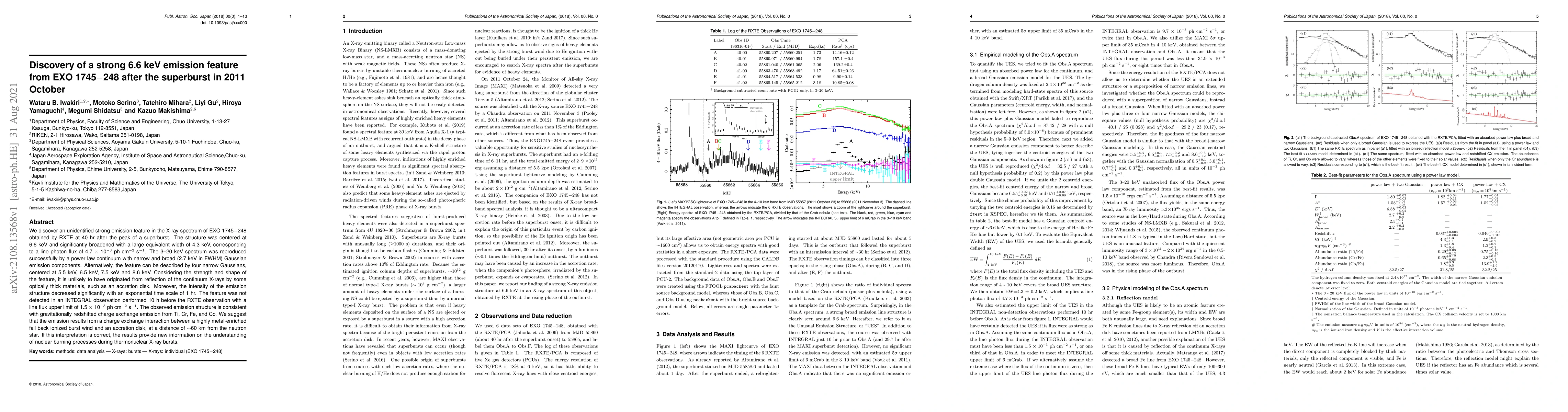 We discover an unidentified strong emission feature in the X-ray spectrum of EXO 1745$-$248 obtained by RXTE at 40 hr after the peak of a superburst. The structure was centered at 6.6 keV and significantly broadened with a large equivalent width of 4.3 keV, corresponding to a line photon flux of 4.7 $\times$ 10$^{-3}$ ph cm$^{-2}$ s$^{-1}$. The 3-20 keV spectrum was reproduced successfully by a power law continuum with narrow and broad (2.7 keV in FWHM) Gaussian emission components. Alternatively, the feature can be described by four narrow Gaussians, centered at 5.5 keV, 6.5 keV, 7.5 keV and 8.6 keV. Considering the strength and shape of the feature, it is unlikely to have originated from reflection of the continuum X-rays by some optically thick materials, such as an accretion disk. Moreover, the intensity of the emission structure decreased significantly with an exponential time scale of 1 hr. The feature was not detected in an INTEGRAL observation performed 10 h before the RXTE observation with a line flux upper limit of 1.5 $\times$ 10$^{-3}$ ph cm$^{-2}$ s$^{-1}$. The observed emission structure is consistent with gravitationally redshifted charge exchange emission from Ti, Cr, Fe, and Co. We suggest that the emission results from a charge exchange interaction between a highly metal-enriched fall back ionized burst wind and an accretion disk, at a distance of $\sim$60 km from the neutron star. If this interpretation is correct, the results provide new information on the understanding of nuclear burning processes during thermonuclear X-ray bursts.