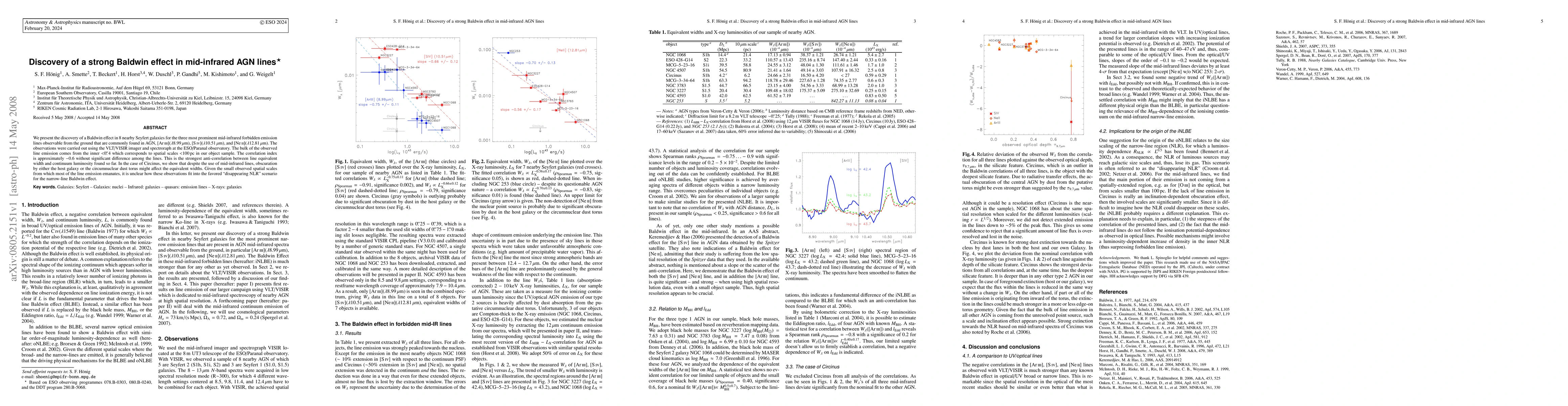 This paper reports a strong Baldwin effect in mid-infrared emission lines from 8 nearby Seyfert galaxies, revealing a significant anti-correlation between line equivalent width and continuum luminosity. The observations suggest that the majority of the line emission originates from regions less than 100 pc in size.
