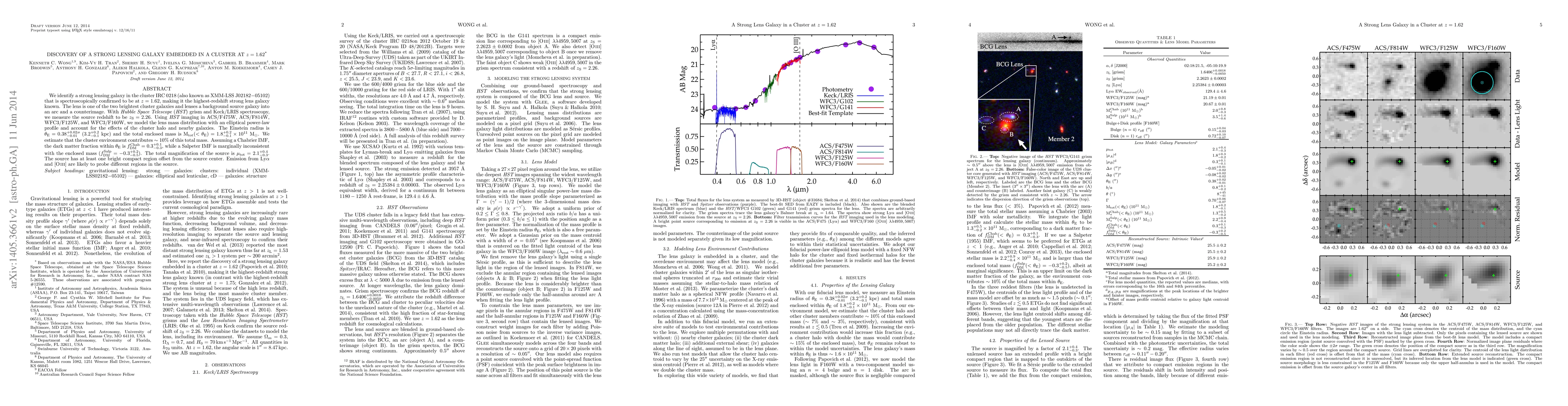 We identify a strong lensing galaxy in the cluster IRC 0218 (also known as XMM-LSS J02182$-$05102) that is spectroscopically confirmed to be at $z=1.62$, making it the highest-redshift strong lens galaxy known. The lens is one of the two brightest cluster galaxies and lenses a background source galaxy into an arc and a counterimage. With Hubble Space Telescope (HST) grism and Keck/LRIS spectroscopy, we measure the source redshift to be $z_{\rm S}=2.26$. Using HST imaging in ACS/F475W, ACS/F814W, WFC3/F125W, and WFC3/F160W, we model the lens mass distribution with an elliptical power-law profile and account for the effects of the cluster halo and nearby galaxies. The Einstein radius is $\theta_{\rm E}=0.38^{+0.02}_{-0.01}$" ($3.2_{-0.1}^{+0.2}$ kpc) and the total enclosed mass is M$_{\rm tot} (< \theta_{\rm E})=1.8^{+0.2}_{-0.1}\times10^{11}~{\rm M}_{\odot}$. We estimate that the cluster environment contributes $\sim10$% of this total mass. Assuming a Chabrier IMF, the dark matter fraction within $\theta_{{\rm E}}$ is $f_{\rm DM}^{{\rm Chab}} = 0.3_{-0.3}^{+0.1}$, while a Salpeter IMF is marginally inconsistent with the enclosed mass ($f_{\rm DM}^{{\rm Salp}} = -0.3_{-0.5}^{+0.2}$). The total magnification of the source is $\mu_{\rm tot}=2.1_{-0.3}^{+0.4}$. The source has at least one bright compact region offset from the source center. Emission from Ly$\alpha$ and [O III] are likely to probe different regions in the source.
