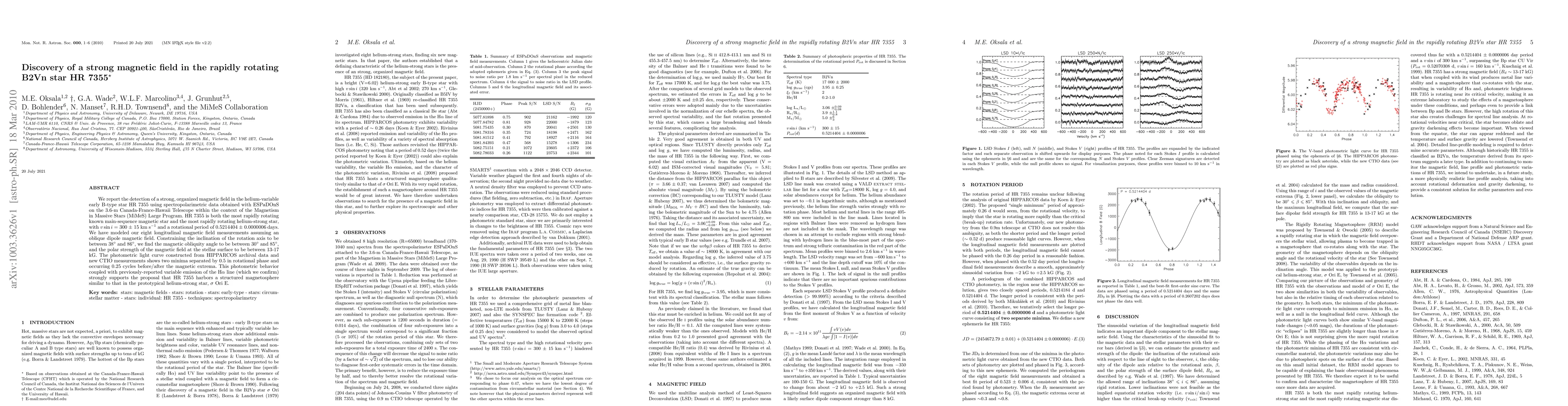 This study reports the discovery of a strong, organized magnetic field in the rapidly rotating B2Vn star HR 7355, detected using spectropolarimetric data. The star's magnetic field strength ranges from 13-17 kG, and its unique rotation and magnetic properties suggest a structured magnetosphere similar to $\sigma$ Ori E.