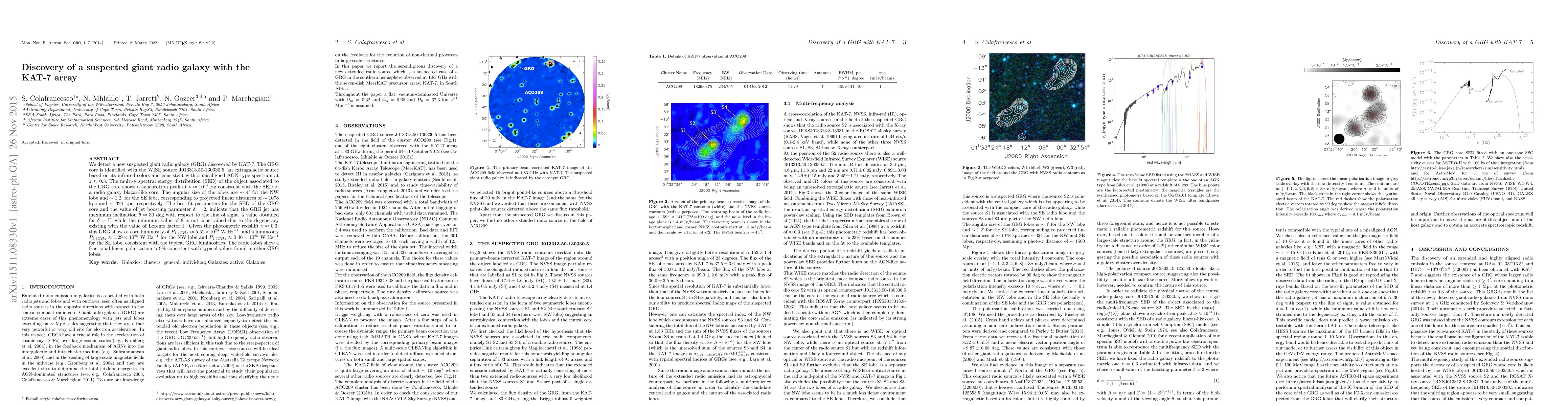 The KAT-7 array detected a new suspected giant radio galaxy (GRG) with a core at WISE J013313.50-130330.5, showing a synchrotron peak at 10^14 Hz. The GRG's NW lobe spans ~1078 kpc and SE lobe ~324 kpc, with typical GRG luminosities and polarization. The jet inclination is estimated at ~30 deg.