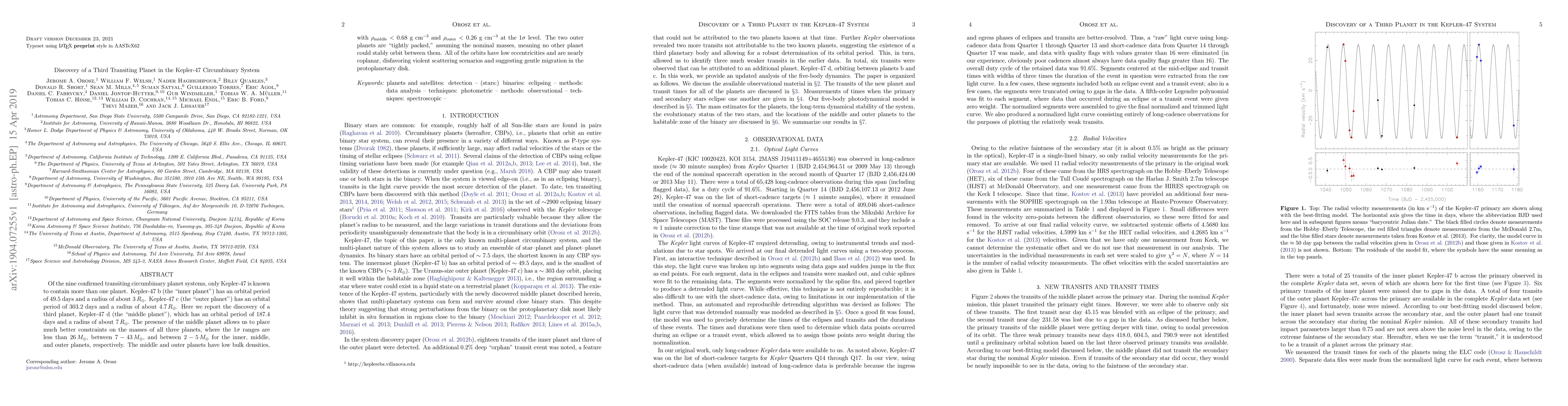 The Kepler-47 circumbinary system has been discovered to contain a third transiting planet, Kepler-47 d, with an orbital period of 187.4 days and a radius of about $7\,R_{\oplus}$. The presence of this third planet refines mass estimates for all three planets, indicating low bulk densities for the outer planets and nearly coplanar, low-eccentricity orbits.