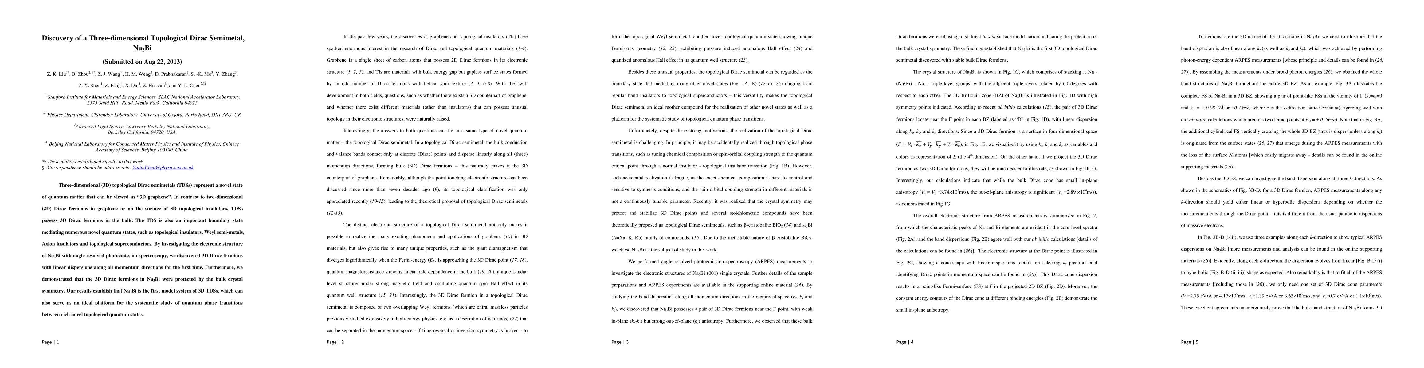 Researchers discovered the first three-dimensional topological Dirac semimetal, Na3Bi, with 3D Dirac fermions exhibiting linear dispersions through angle resolved photoemission spectroscopy. This material serves as a model system for studying quantum phase transitions between various topological quantum states.