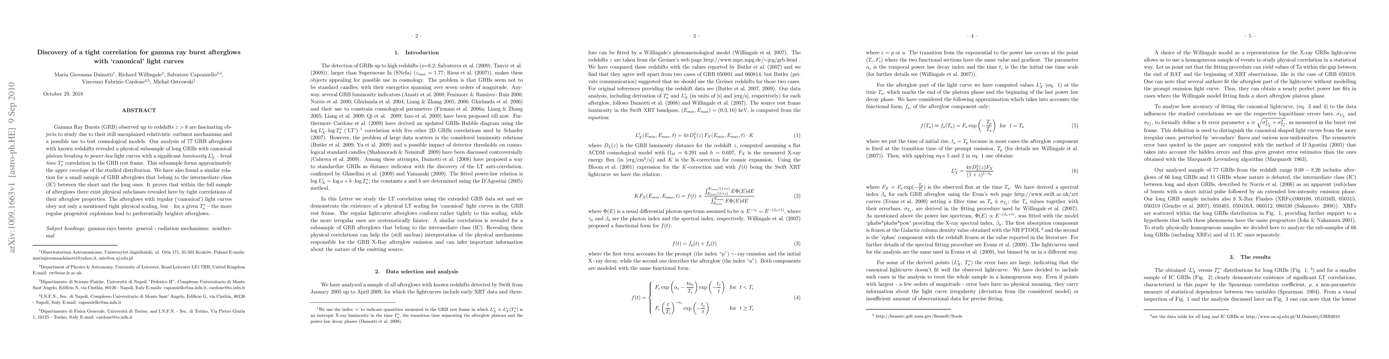 Gamma Ray Bursts (GRB) observed up to redshifts $z>8$ are fascinating objects to study due to their still unexplained relativistic outburst mechanisms and a possible use to test cosmological models. Our analysis of 77 GRB afterglows with known redshifts revealed a physical subsample of long GRBs with canonical {\it plateau breaking to power-law} light curves with a significant {\it luminosity $L^*_X$ - break time $T^*_a$} correlation in the GRB rest frame. This subsample forms approximately the {\it upper envelope} of the studied distribution. We have also found a similar relation for a small sample of GRB afterglows that belong to the intermediate class (IC) between the short and the long ones. It proves that within the full sample of afterglows there exist physical subclasses revealed here by tight correlations of their afterglow properties. The afterglows with regular (`canonical') light curves obey not only a mentioned tight physical scaling, but -- for a given $T^*_a$ -- the more regular progenitor explosions lead to preferentially brighter afterglows.