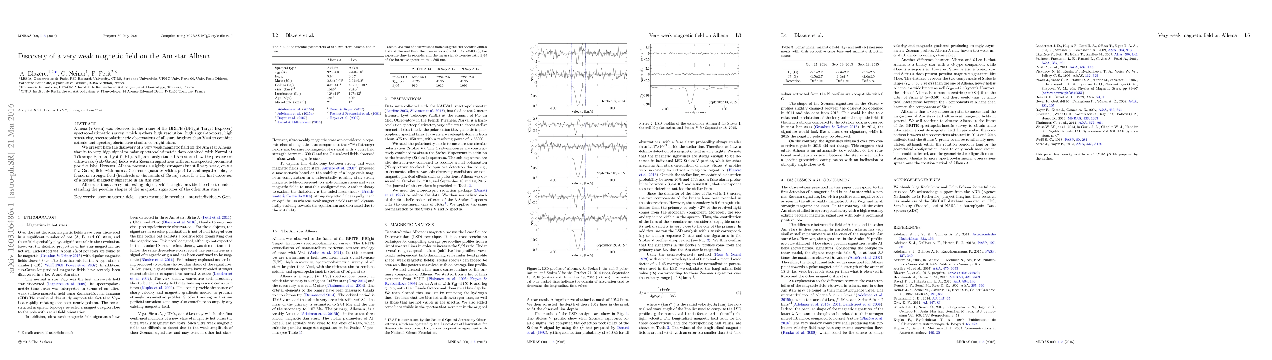 Alhena ($\gamma$ Gem) was observed in the frame of the BRITE (BRIght Target Explorer) spectropolarimetric survey, which gathers high resolution, high signal-to-noise, high sensitivity, spectropolarimetric observations of all stars brighter than V=4 to combine seismic and spectropolarimetric studies of bright stars. We present here the discovery of a very weak magnetic field \textbf{on} the Am star Alhena, thanks to very high signal-to-noise spectropolarimetric data obtained with Narval at T\'elescope Bernard Lyot (TBL). All previously studied Am stars show the presence of ultra-weak (sub-Gauss) fields with Zeeman signatures with an unexpected prominent positive lobe. However, Alhena presents a slightly stronger (but still very weak, only a few Gauss) field with normal Zeeman signatures with a positive and negative lobe, as found in stronger field (hundreds or thousands of Gauss) stars. It is the first detection of a normal magnetic signature in an Am star. Alhena is thus a very interesting object, which might provide the clue to understanding the peculiar shapes of the magnetic signatures of the other Am stars.