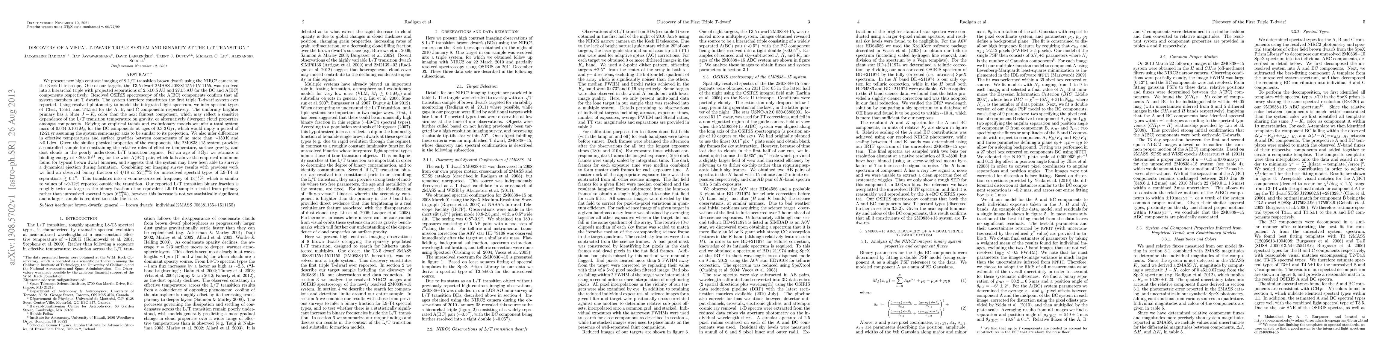 We present new high contrast imaging of 8 L/T transition brown dwarfs using the NIRC2 camera on the Keck II telescope. One of our targets, the T3.5 dwarf 2MASS J08381155 + 1511155, was resolved into a hierarchal triple with projected separations of 2.5+/-0.5 AU and 27+/-5 AU for the BC and A(BC) components respectively. Resolved OSIRIS spectroscopy of the A(BC) components confirm that all system members are T dwarfs. The system therefore constitutes the first triple T-dwarf system ever reported. Using resolved photometry to model the integrated-light spectrum, we infer spectral types of T3, T3, and T4.5 for the A, B, and C components respectively. The uniformly brighter primary has a bluer J-Ks color than the next faintest component, which may reflect a sensitive dependence of the L/T transition temperature on gravity, or alternatively divergent cloud properties amongst components. Relying on empirical trends and evolutionary models we infer a total system mass of 0.034-0.104 Msun for the BC components at ages of 0.3-3 Gyr, which would imply a period of 12-21 yr assuming the system semi-major axis to be similar to its projection. We also infer differences in effective temperatures and surface gravities between components of no more than ~150 K and ~0.1 dex. Given the similar physical properties of the components, the 2M0838+15 system provides a controlled sample for constraining the relative roles of effective temperature, surface gravity, and dust clouds in the poorly understood L/T transition regime. Combining our imaging survey results with previous work we find an observed binary fraction of 4/18 or 22_{-8}^{+10}% for unresolved spectral types of L9-T4 at separations >~0.1 arcsec. This translates into a volume-corrected frequency of 13^{-6}_{+7}%, which is similar to values of ~9-12% reported outside the transition. (ABRIDGED)
