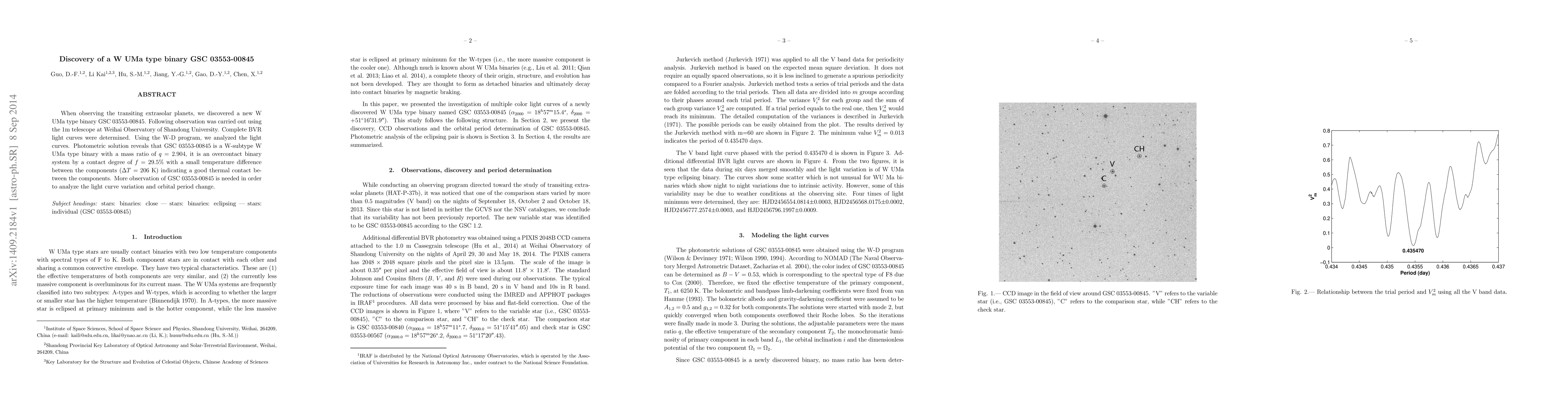 The research discovered a new W UMa type binary system, GSC 03553-00845, using observations from the Weihai Observatory. The system is an overcontact binary with a mass ratio of 2.904 and a contact degree of 29.5%, indicating good thermal contact between the components. Further observations are needed to analyze light curve variations and orbital period changes.