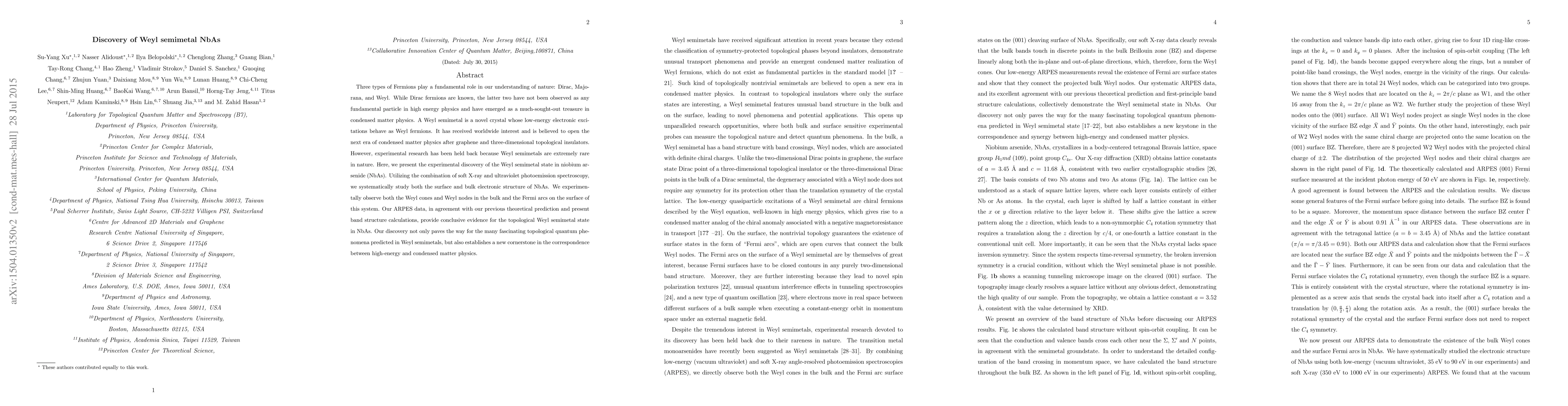 Summary: Researchers have identified a Weyl fermion semimetal state in NbAs, characterized by topological Fermi arc surface states, marking a significant development in topological materials research.