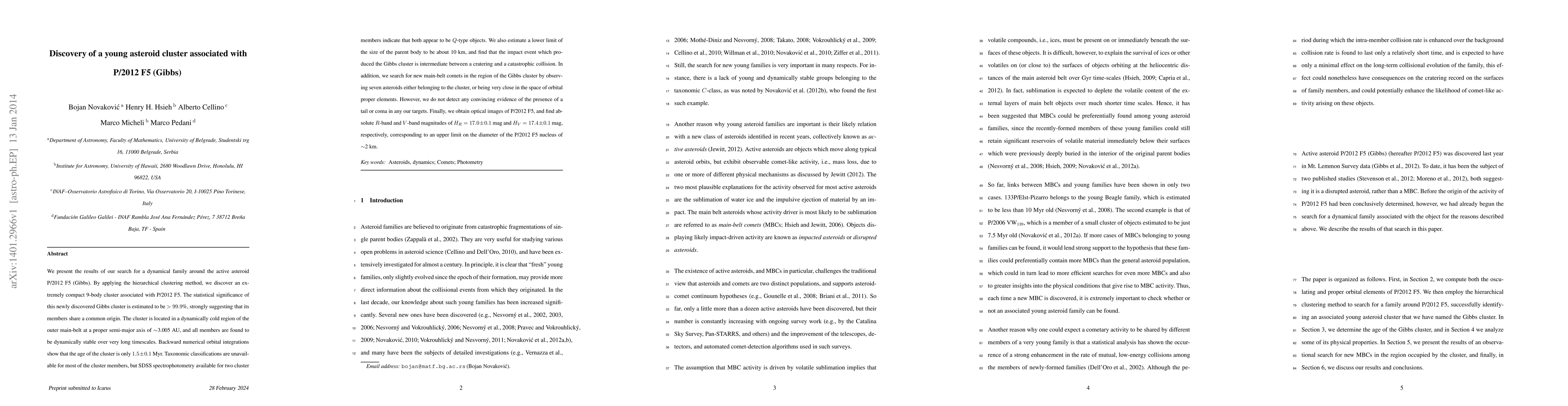 We present the results of our search for a dynamical family around the active asteroid P/2012F5 (Gibbs). By applying the hierarchical clustering method, we discover an extremely compact 9-body cluster associated with P/2012F5. The statistical significance of this newly discovered Gibbs cluster is estimated to be >99.9%, strongly suggesting that its members share a common origin. The cluster is located in a dynamically cold region of the outer main-belt at a proper semi-major axis of about 3.005 AU, and all members are found to be dynamically stable over very long time-scales. Backward numerical orbital integrations show that the age of the cluster is only 1.5 $\pm$ 0.1 Myr. Taxonomic classifications are unavailable for most of the cluster members, but SDSS spectrophotometry available for two cluster members indicate that both appear to be $Q$-type objects. We also estimate a lower limit of the size of the parent body to be about 10 km, and find that the impact event which produced the Gibbs cluster is intermediate between a cratering and a catastrophic collision. In addition, we search for new main-belt comets in the region of the Gibbs cluster by observing seven asteroids either belonging to the cluster, or being very close in the space of orbital proper elements. However, we do not detect any convincing evidence of the presence of a tail or coma in any our targets. Finally, we obtain optical images of P/2012F5, and find absolute R-band and V-band magnitudes of $H_R$ = 17.0 $\pm$ 0.1 mag and $H_V$ = 17.4 $\pm$ 0.1 mag, respectively, corresponding to an upper limit on the diameter of the P/2012F5 nucleus of about 2 km.
