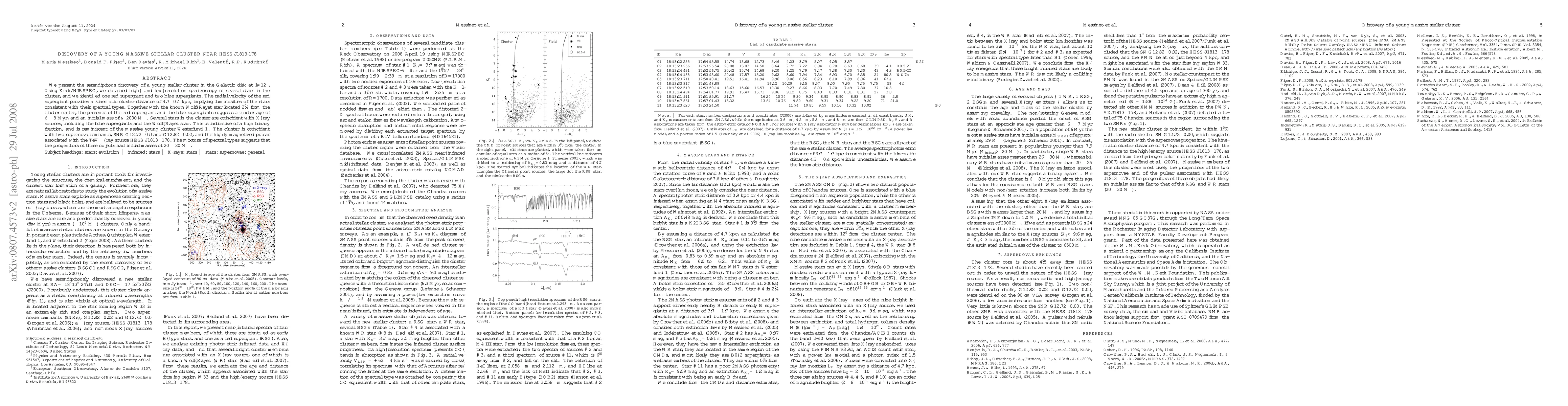 The paper reports the discovery of a young, massive stellar cluster near HESS J1813-178, characterized by a red supergiant, two blue supergiants, and a Wolf-Rayet star, suggesting an age of 6-8 Myr and an initial mass of 2000 Msun. The cluster's proximity to supernova remnants and a TeV gamma-ray source indicates a high binary fraction and potential stellar progenitors with initial masses of 20-30 Msun.
