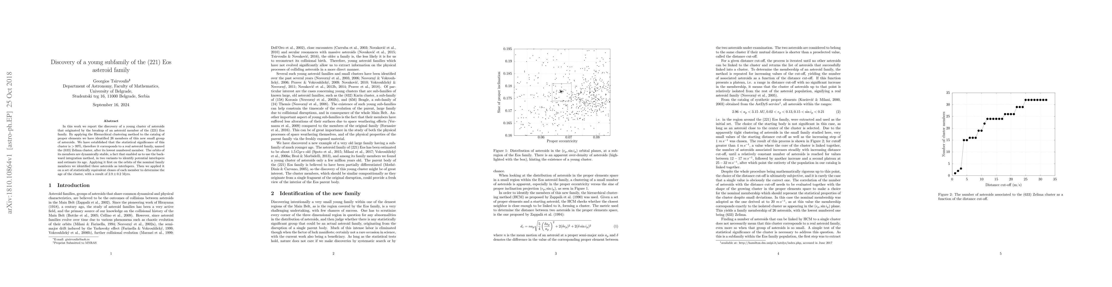 In this work we report the discovery of a young cluster of asteroids that originated by the breakup of an asteroid member of the (221)Eos family. By applying the Hierarchical clustering method to the catalog of proper elements we have identified 26 members of this new small group of asteroids. We have established that the statistical significance of this cluster is $>99\%$, therefore it corresponds to a real asteroid family, named the (633)Zelima cluster, after its lowest numbered member. The orbits of its members are dynamically stable, a fact that enabled us to use the backward integration method, in two variants to identify potential interlopers and estimate its age. Applying it first on the orbits of the nominal family members we identified three asteroids as interlopers. Then we applied it on a set of statistically equivalent clones of each member to determine the age of the cluster, with a result of $2.9\pm0.2$Myrs.