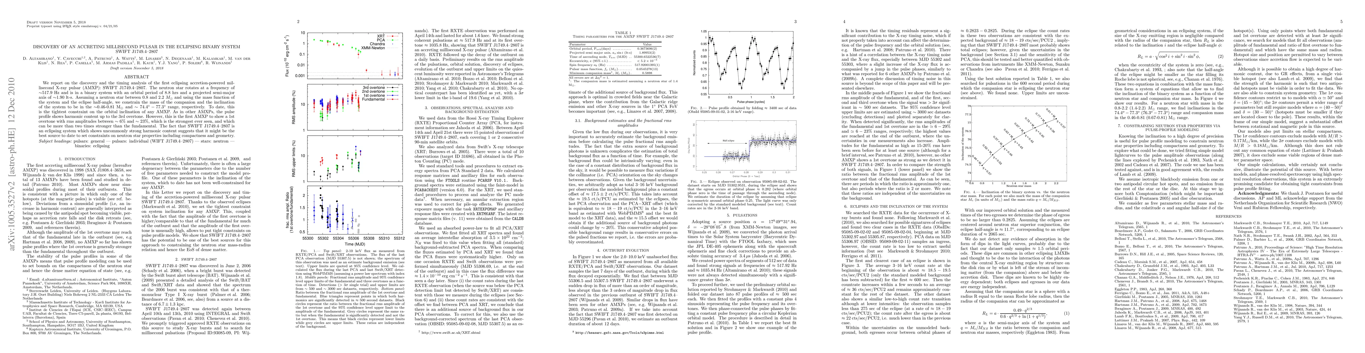 This paper reports the discovery of the first eclipsing accretion-powered millisecond X-ray pulsar, SWIFT J1749.4-2807, with a neutron star rotating at ~517.9 Hz. The pulsar's strong harmonic content, especially the first overtone, suggests it could provide tight constraints on neutron star properties.