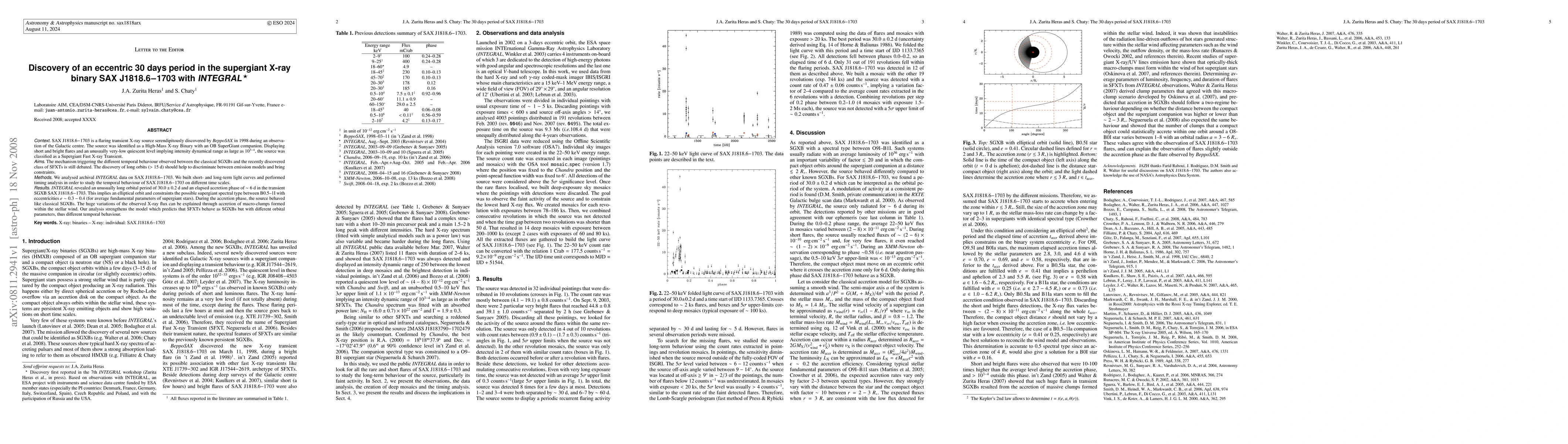 SAX J1818.6-1703 is a flaring transient X-ray source serendipitously discovered by BeppoSAX in 1998 during an observation of the Galactic centre. The source was identified as a High-Mass X-ray Binary with an OB SuperGiant companion. Displaying short and bright flares and an unusually very-low quiescent level implying intensity dynamical range as large as 1e3-4, the source was classified as a Supergiant Fast X-ray Transient. The mechanism triggering the different temporal behaviour observed between the classical SGXBs and the recently discovered class of SFXTs is still debated. The discovery of long orbits (>15 d) should help to discriminate between emission models and bring constraints. We analysed archival INTEGRAL data on SAX J1818.6-1703. We built short- and long-term light curves and performed timing analysis in order to study the temporal behaviour of SAX J1818.6-1703 on different time scales. INTEGRAL revealed an unusually long orbital period of 30.0+/-0.2 d and an elapsed accretion phase of ~6 d in the transient SGXB SAX J1818.6-1703. This implies an elliptical orbit and constraints the possible supergiant spectral type between B0.5-1I with eccentricities e~0.3-0.4 (for average fundamental parameters of supergiant stars). During the accretion phase, the source behaved like classical SGXBs. The huge variations of the observed X-ray flux can be explained through accretion of macro-clumps formed within the stellar wind. Our analysis strengthens the model which predicts that SFXTs behave as SGXBs but with different orbital parameters, thus different temporal behaviour.
