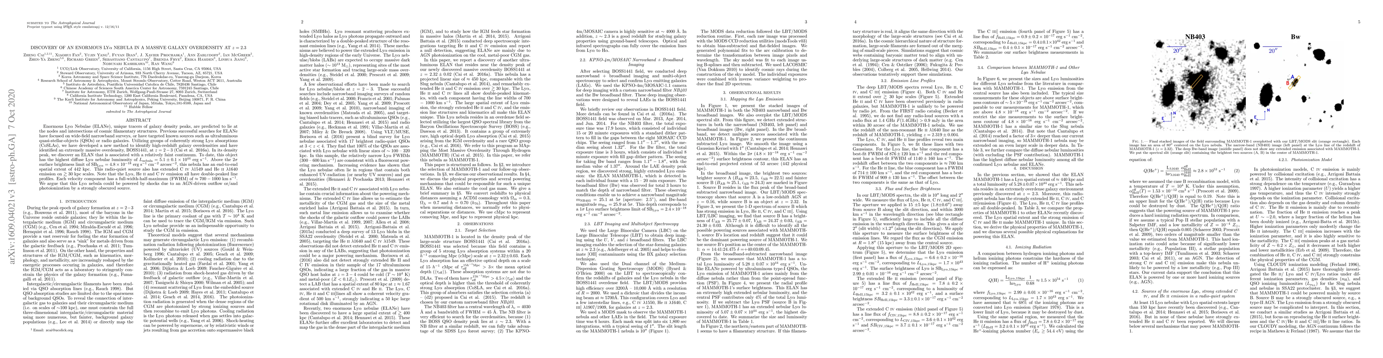 This paper reports the discovery of an enormous Ly$\alpha$ nebula (ELAN) in a massive galaxy overdensity at $z=2.3$, identified using a new method based on coherently strong Ly$\alpha$ absorptions. The nebula has an unprecedented luminosity of $5.1\times10^{44}$ erg s$^{-1}$ and spans 442 kpc, suggesting it may be powered by an AGN-driven outflow or a strongly obscured source.