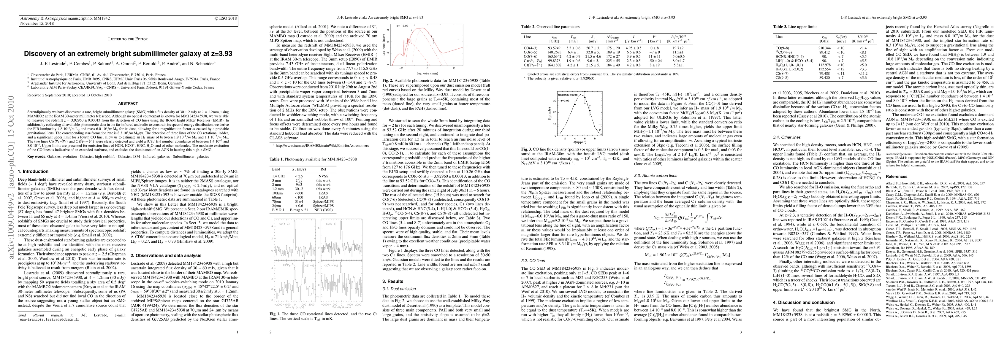 This research paper details the discovery of a rare, extremely bright submillimeter galaxy (SMG) at redshift z=3.93. Utilizing the IRAM 30-meter telescope and EMIR, they detected CO lines, estimating its FIR luminosity, mass, and star-formation rate. The findings suggest an extended starburst scenario, excluding Active Galactic Nuclei (AGN) dominance, and present upper limits for other molecule emission lines.