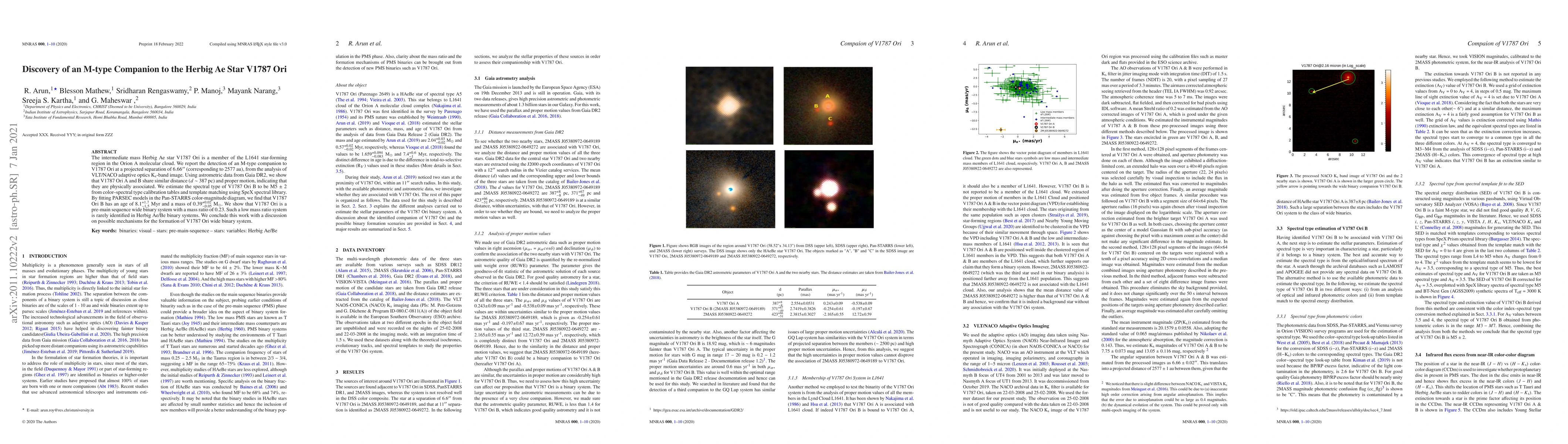 The intermediate mass Herbig Ae star V1787 Ori is a member of the L1641 star-forming region in the Orion A molecular cloud. We report the detection of an M-type companion to V1787 Ori at a projected separation of 6.66" (corresponding to 2577 au), from the analysis of VLT/NACO adaptive optics $K_s$-band image. Using astrometric data from Gaia DR2, we show that V1787 Ori A and B share similar distance ($d$ $\sim$ 387 pc) and proper motion, indicating that they are physically associated. We estimate the spectral type of V1787 Ori B to be M5 $\pm$ 2 from color--spectral type calibration tables and template matching using SpeX spectral library. By fitting PARSEC models in the Pan-STARRS color-magnitude diagram, we find that V1787 Ori B has an age of 8.1$^{+1.7}_{-1.5}$ Myr and a mass of 0.39$^{+0.02}_{-0.05}$ $M_\odot$. We show that V1787 Ori is a pre-main sequence wide binary system with a mass ratio of 0.23. Such a low mass ratio system is rarely identified in Herbig Ae/Be binary systems. We conclude this work with a discussion on possible mechanisms for the formation of V1787 Ori wide binary system.
