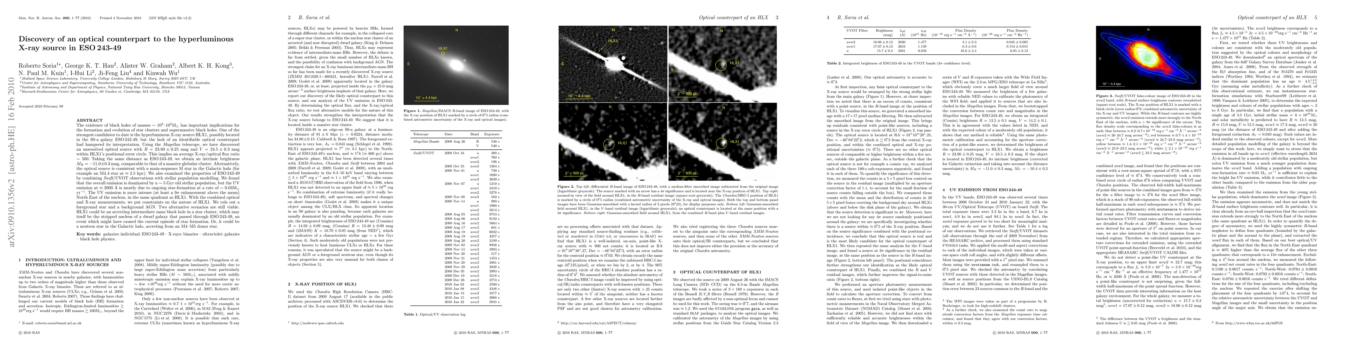 The existence of black holes of masses ~ 10^2-10^5 Msun has important implications for the formation and evolution of star clusters and supermassive black holes. One of the strongest candidates to date is the hyperluminous X-ray source HLX1, possibly located in the S0-a galaxy ESO243-49, but the lack of an identifiable optical counterpart had hampered its interpretation. Using the Magellan telescope, we have discovered an unresolved optical source with R = (23.80 +/- 0.25) mag and V = (24.5 +/- 0.3) mag within HLX1's positional error circle. This implies an average X-ray/optical flux ratio ~ 500. Taking the same distance as ESO243-49, we obtain an intrinsic brightness M_R = (-11.0 +/- 0.3) mag, comparable to that of a massive globular cluster. Alternatively, the optical source is consistent with a main-sequence M star in the Galactic halo (for example an M4.4 star at ~ 2.5 kpc). We also examined the properties of ESO243-49 by combining Swift/UVOT observations with stellar population modelling. We found that the overall emission is dominated by a ~5 Gyr old stellar population, but the UV emission at ~2000 Ang is mostly due to ongoing star-formation at a rate of ~ 0.03 Msun/yr. The UV emission is more intense (at least a 9-sigma enhancement above the mean) North East of the nucleus, in the same quadrant as HLX1. With the combined optical and X-ray measurements, we put constraints on the nature of HLX1. We rule out a foreground star and a background AGN. Two alternative scenarios are still viable. HLX1 could be an accreting intermediate-mass black hole in a star cluster, which may itself be the stripped nucleus of a dwarf galaxy that passed through ESO243-49, an event which might have caused the current episode of star formation. Or, it could be a neutron star in the Galactic halo, accreting from an M4-M5 donor star.