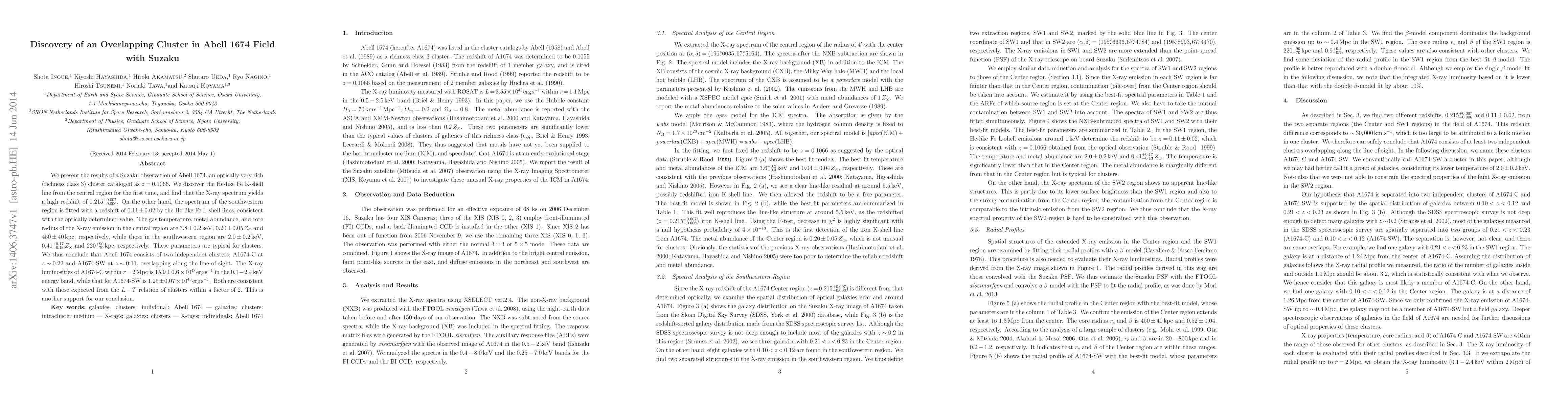 We present the results of a Suzaku observation of Abell 1674, an optically very rich (richness class 3) cluster cataloged as z = 0.1066. We discover the He-like Fe K-shell line from the central region for the first time, and find that the X-ray spectrum yields a high redshift of 0.215^{+0.007}_{-0.006}. On the other hand, the spectrum of the southwestern region is fitted with a redshift of 0.11 \pm 0.02 by the He-like Fe L-shell lines, consistent with the optically determined value. The gas temperature, metal abundance, and core radius of the X-ray emission in the central region are 3.8 \pm 0.2 keV, 0.20 \pm 0.05 Z_solar and 450 \pm 40 kpc, respectively, while those in the southwestern region are 2.0 \pm 0.2 keV, 0.41^{+0.17}_{-0.13} Z_solar and 220^{+90}_{-70} kpc, respectively. These parameters are typical for clusters. We thus conclude that Abell 1674 consists of two independent clusters, A1674-C at z ~0.22 and A1674-SW at z ~0.11, overlapping along the line of sight. The X-ray luminosities of A1674-C within r = 2 Mpc is 15.9 \pm 0.6 \times 10^{43} erg s^{-1} in the 0.1-2.4 keV energy band, while that for A1674-SW is 1.25 \pm 0.07 \times 10^{43} erg s^{-1}. Both are consistent with those expected from the L-T relation of clusters within a factor of 2. This is another support for our conclusion.