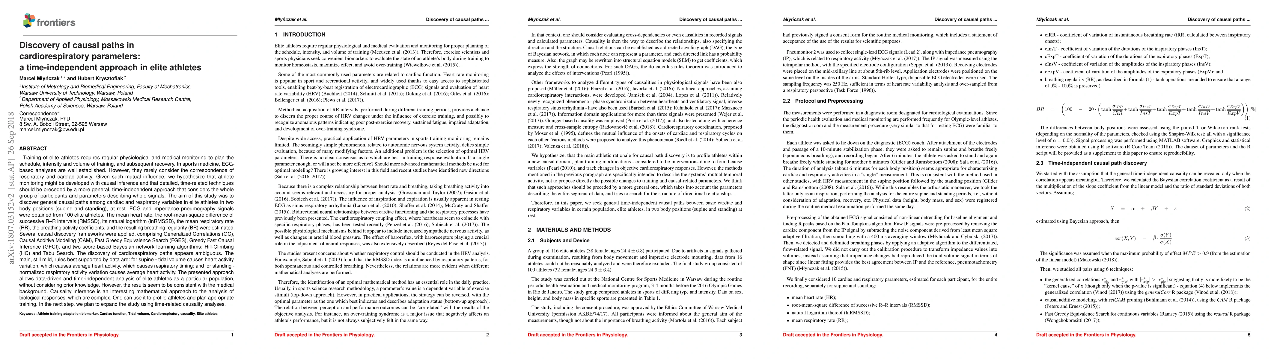 Training of elite athletes requires regular physiological and medical monitoring to plan the schedule, intensity and volume of training, and subsequent recovery. In sports medicine, ECG-based analyses are well established. However, they rarely consider the correspondence of respiratory and cardiac activity. Given such mutual influence, we hypothesize that athlete monitoring might be developed with causal inference and that detailed, time-related techniques should be preceded by a more general, time-independent approach that considers the whole group of participants and parameters describing whole signals. The aim of this study was to discover general causal paths among cardiac and respiratory variables in elite athletes in two body positions (supine and standing), at rest. ECG and impedance pneumography signals were obtained from 100 elite athletes. The mean HR, the RMSSD, its natural logarithm, the mean respiratory rate, the breathing activity coefficients, and the resulting breathing regularity were estimated. Several causal discovery frameworks were applied: generalized correlations, CAM, FGES, GFCI, and two Bayesian network learning algorithms: Hill-Climbing and Tabu. The main, still mild, rules best supported by data are: for supine - tidal volume causes heart activity variation, which causes HR, which causes respiratory timing; and for standing - normalized respiratory activity variation causes average heart activity. The presented approach allows data-driven and time-independent analysis of elite athletes as a particular population, without considering prior knowledge. However, the results seem to be consistent with the medical background. Causality inference is an interesting mathematical approach to the analysis of biological responses, which are complex. One can use it to profile athletes and plan appropriate training.