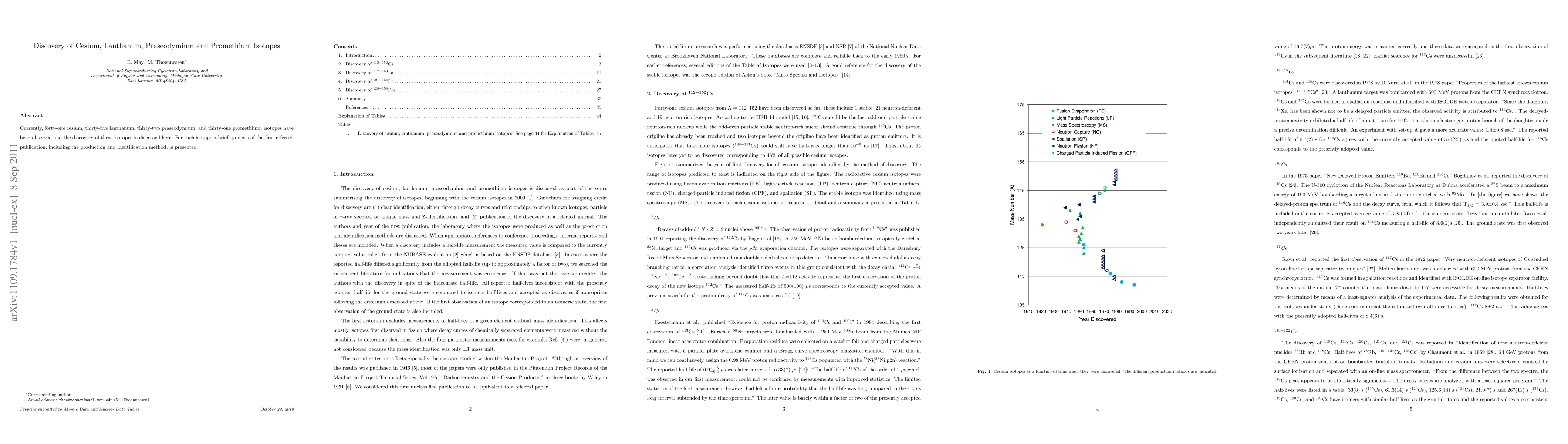Currently, forty-one cesium, thirty-five lanthanum, thirty-two praseodymium, and thirty-one promethium, isotopes have been observed and the discovery of these isotopes is discussed here. For each isotope a brief synopsis of the first refereed publication, including the production and identification method, is presented.